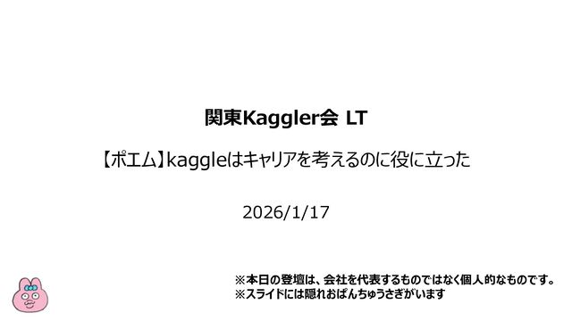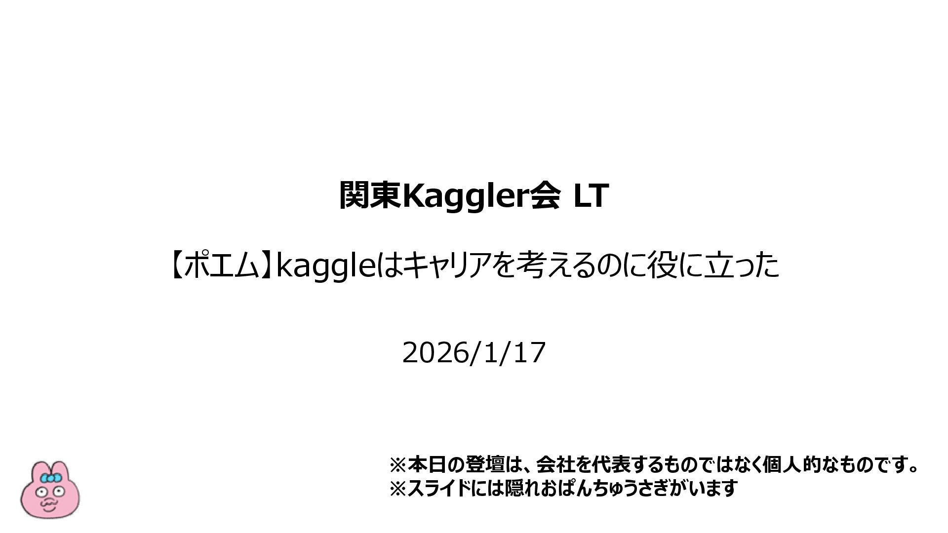 【ポエム】kaggleはキャリアを考えるのに役に立った 2026/1/17 関東Kaggler会 LT ※本日の登壇は、会社を代表するものではなく個人的なものです。 ※スライドには隠れおぱんちゅうさぎがいます