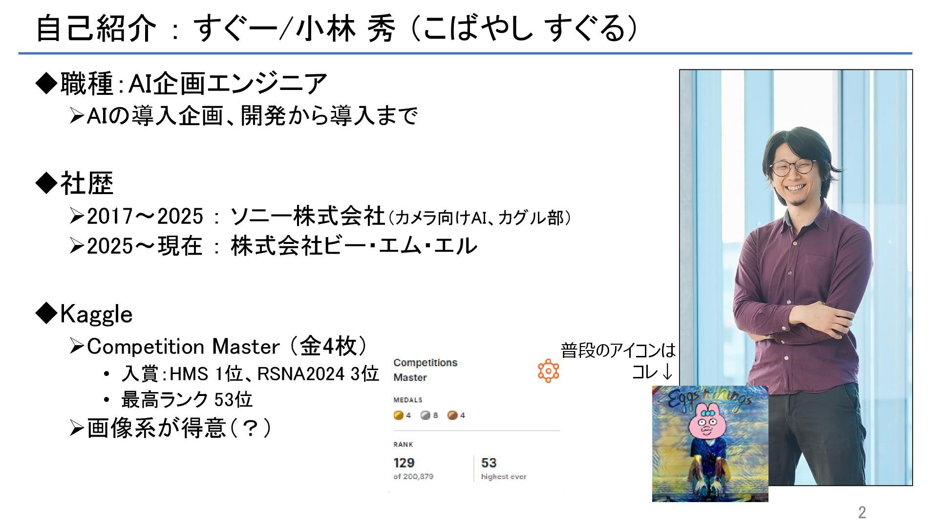 : ソニー株式会社(カメラ向けAI、カグル部) ➢2025~現在 : 株式会社ビー・エム・エル ◆Kaggle ➢Competition Master (金4枚) • 入賞:HMS 1位、RSNA2024 3位 • 最高ランク 53位 ➢画像系が得意(?) 2 普段のアイコンは コレ↓