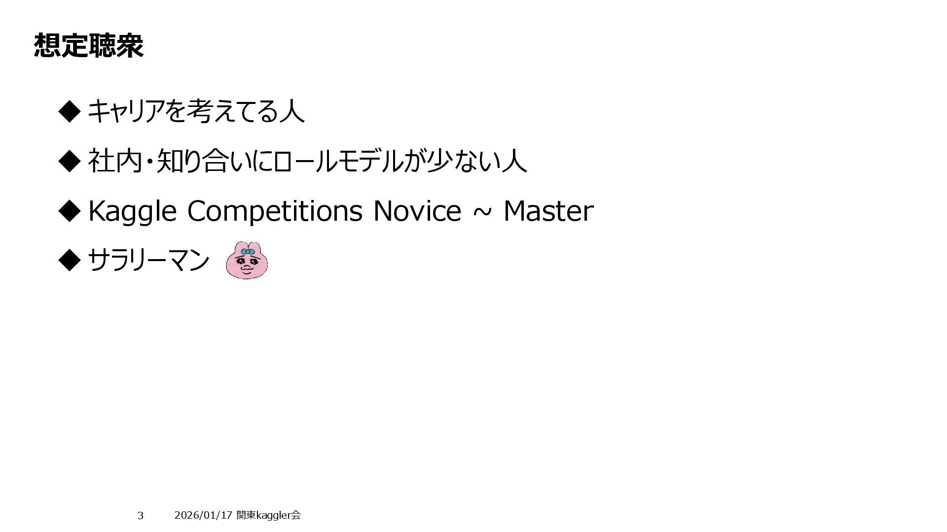 2026/01/17 関東kaggler会 3 想定聴衆 ◆ キャリアを考えてる人 ◆ 社内・知り合いにロールモデルが少ない人 ◆ Kaggle