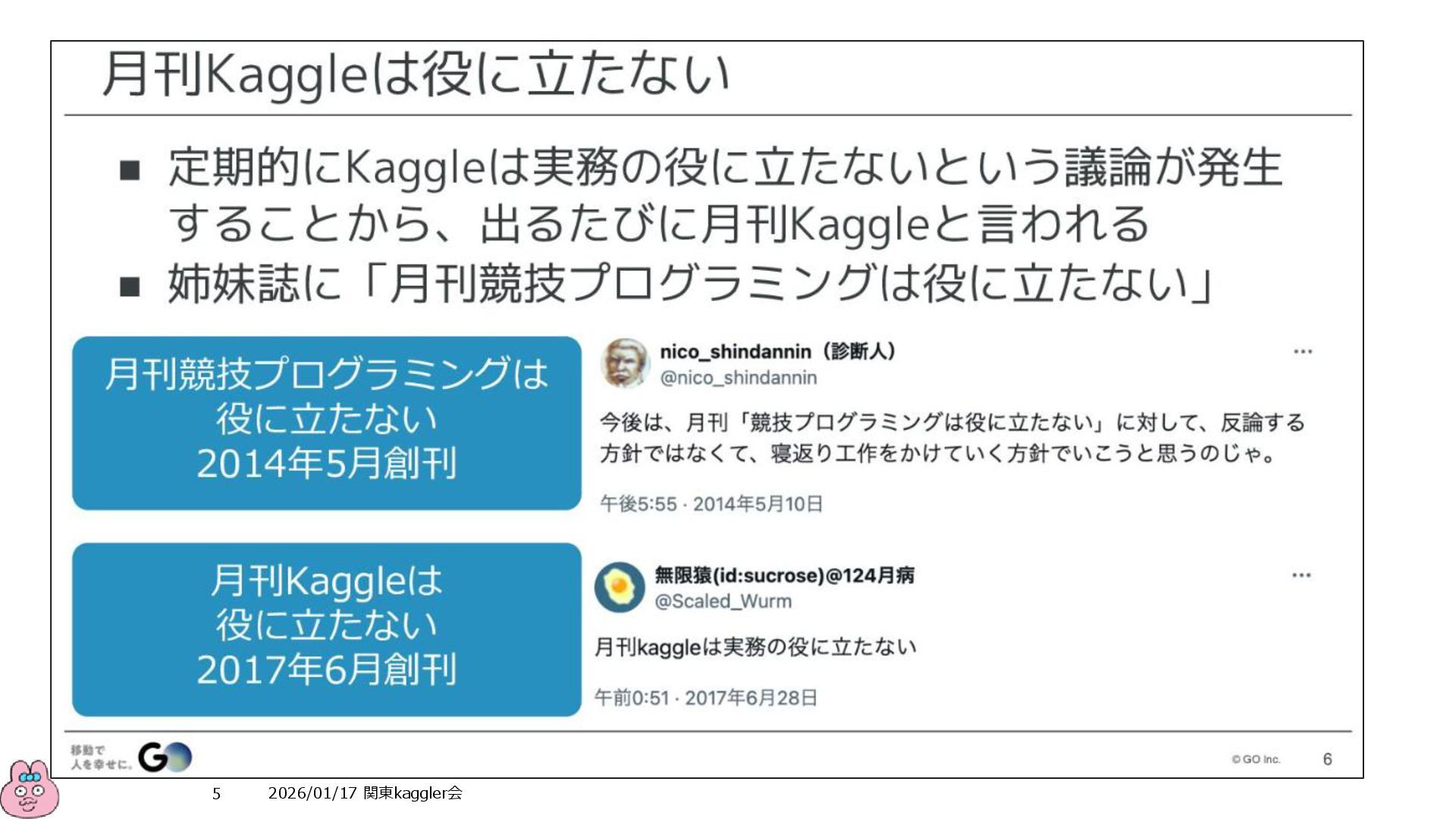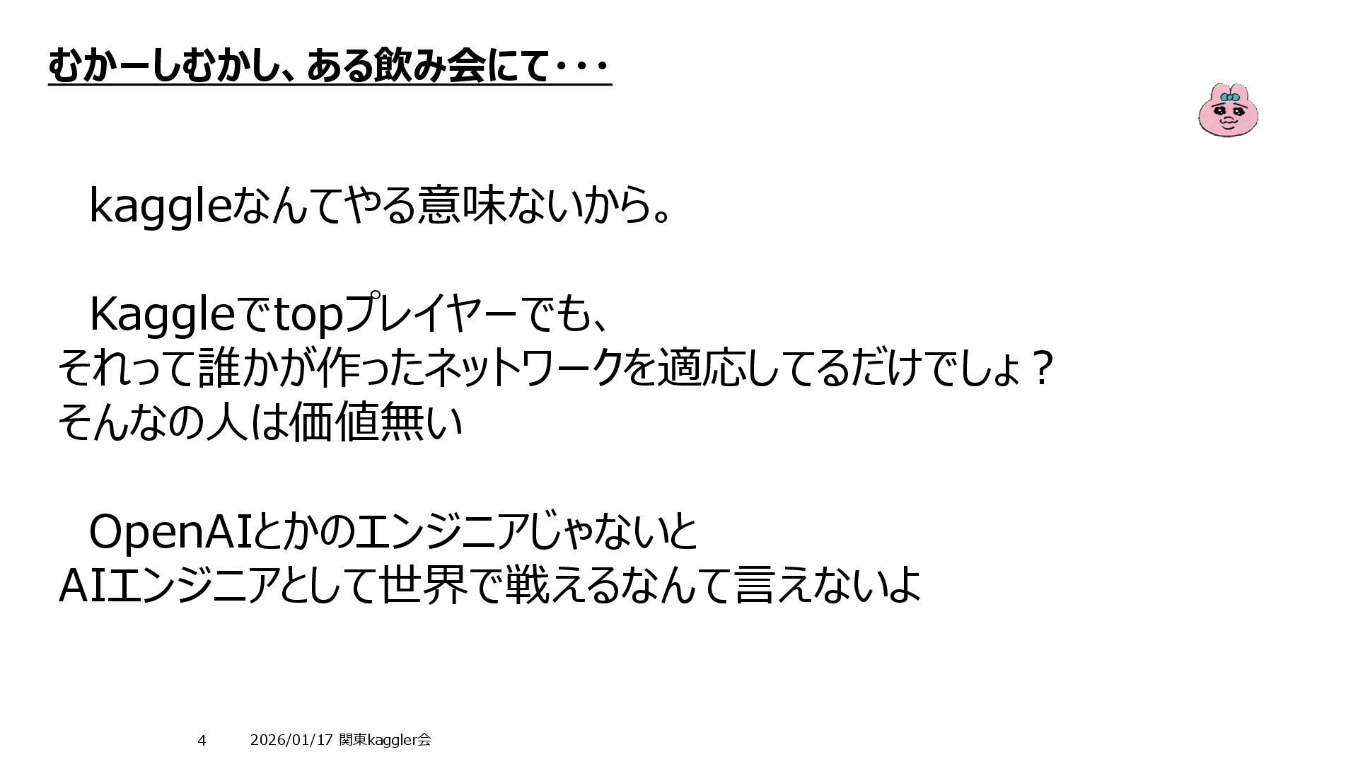 2026/01/17 関東kaggler会 4 むかーしむかし、ある飲み会にて・・・ kaggleなんてやる意味ないから。 Kaggleでtopプレイヤーでも、 それって誰かが作ったネットワークを適応してるだけでしょ? そんなの人は価値無い OpenAIとかのエンジニアじゃないと AIエンジニアとして世界で戦えるなんて言えないよ