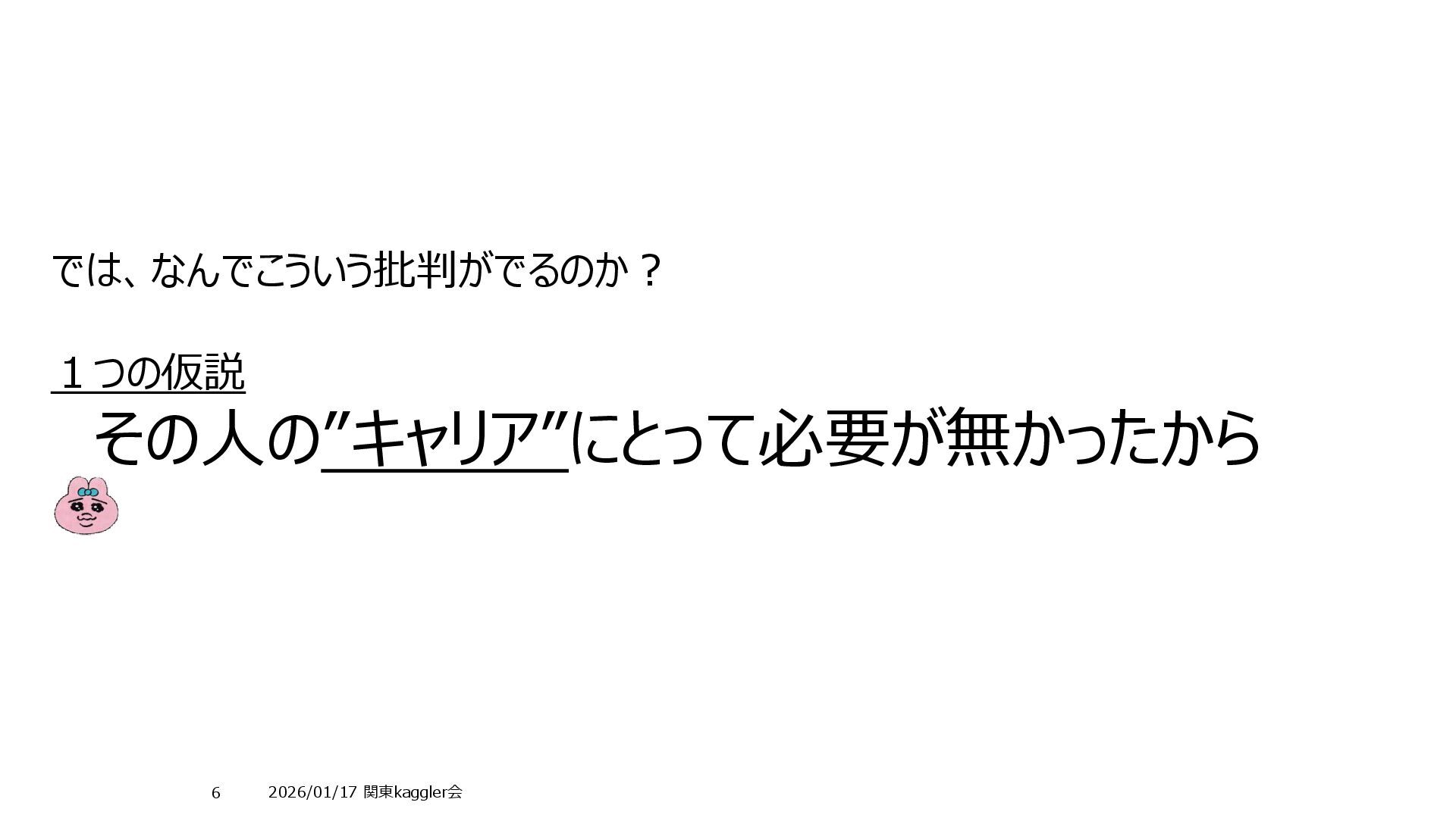 2026/01/17 関東kaggler会 6 では、なんでこういう批判がでるのか? 1つの仮説 その人の”キャリア”にとって必要が無かったから