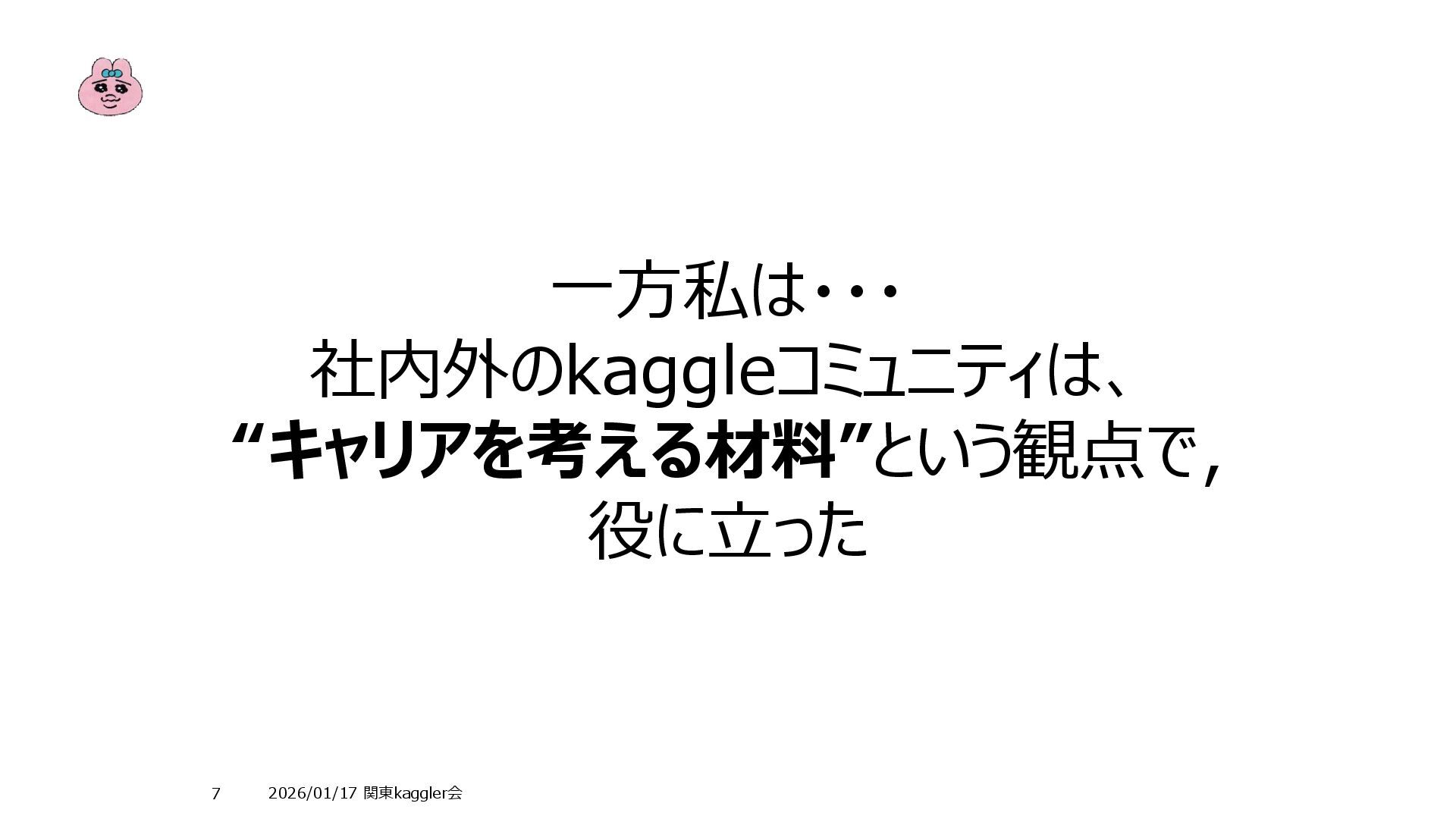 2026/01/17 関東kaggler会 7 一方私は・・・ 社内外のkaggleコミュニティは、 “キャリアを考える材料”という観点で, 役に立った