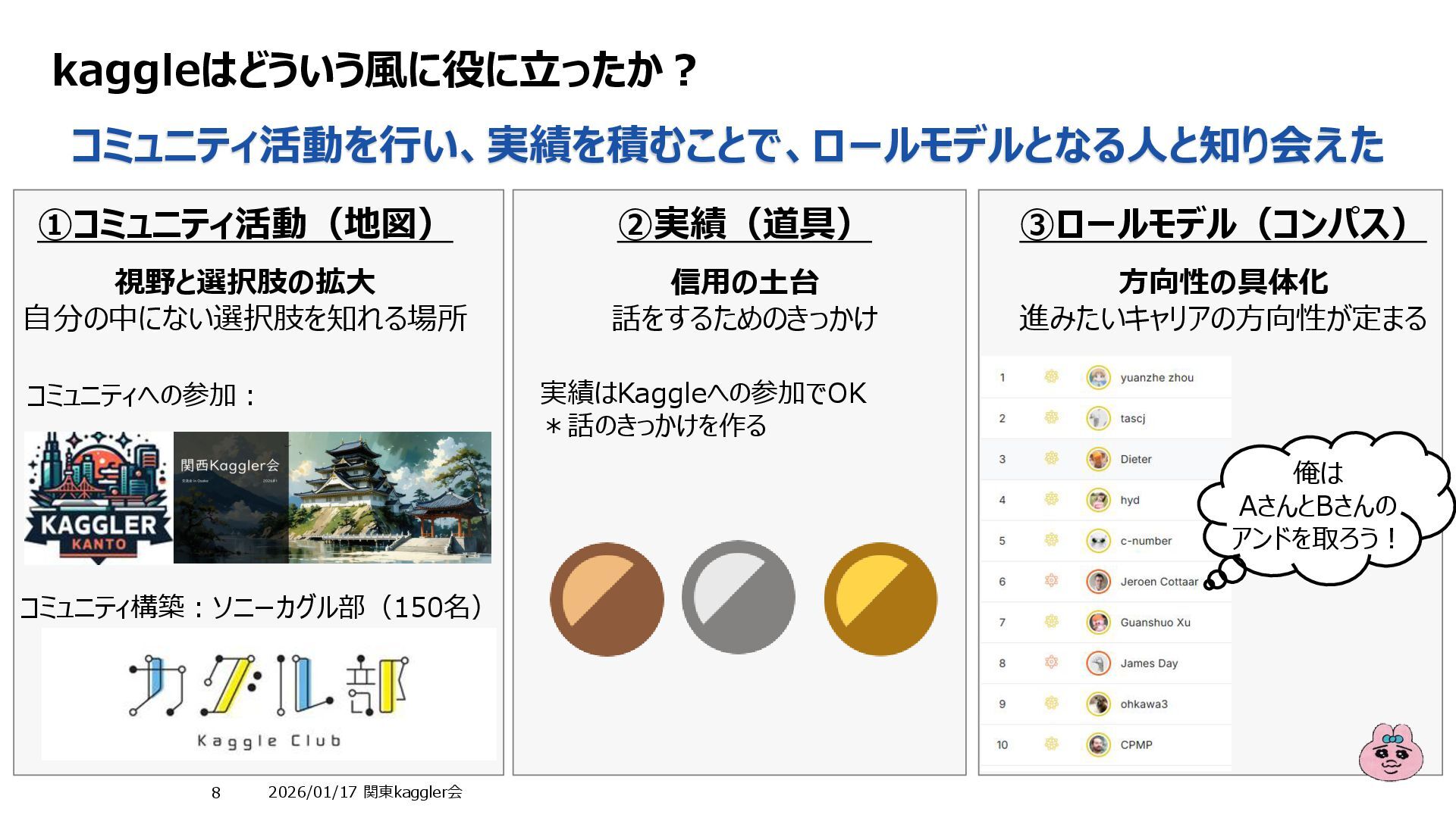 2026/01/17 関東kaggler会 8 kaggleはどういう風に役に立ったか? ①コミュニティ活動(地図) ③ロールモデル(コンパス) 視野と選択肢の拡大 自分の中にない選択肢を知れる場所 方向性の具体化 進みたいキャリアの方向性が定まる