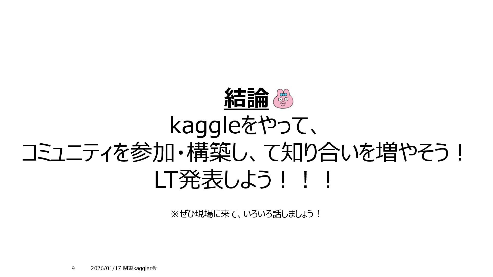 2026/01/17 関東kaggler会 9 結論 kaggleをやって、 コミュニティを参加・構築し、て知り合いを増やそう! LT発表しよう!!! ※ぜひ現場に来て、いろいろ話しましょう!