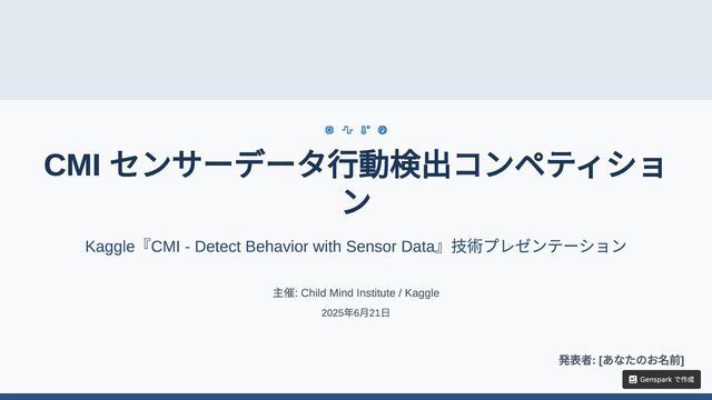 センサーデータ行動検出コンペティショ ン Kaggle 『CMI - Detect Behavior with Sensor Data 』技術プレゼンテーション 主催: Child Mind Institute / Kaggle 2025 年6 月21 日 Genspark で作成