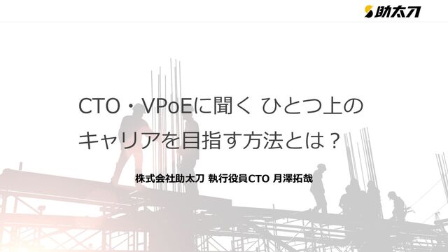 01 グリー株式会社 2013.04- 仕事内容 Job 02 2017.03- 月澤 拓哉 Employee Introduction 助太刀の開発組織作り 業界を変えられるサービスを 生み出せる開発組織を作る仕事 Tsukisawa Takuya 執行役員 CTO これからやりたいこと 技術負債の返済と開発サイクルの効 率化、社員旅行 1987年生まれ 秋田県出身 北海道大学大学院 情報科学研究科卒 激辛料理、お酒、格闘技、筋トレ Twitter @tksw_009 SNS 好きなこと Like 03 株式会社ジーニー 今やっていること 主にバックエンド開発、開発組織作りや開発の内製化などに従事 2020年11月 VPoEとして入社 2021年6月 執行役員就任 2022年11月 執行役員CTO就任 2020.11- 株式会社助太刀