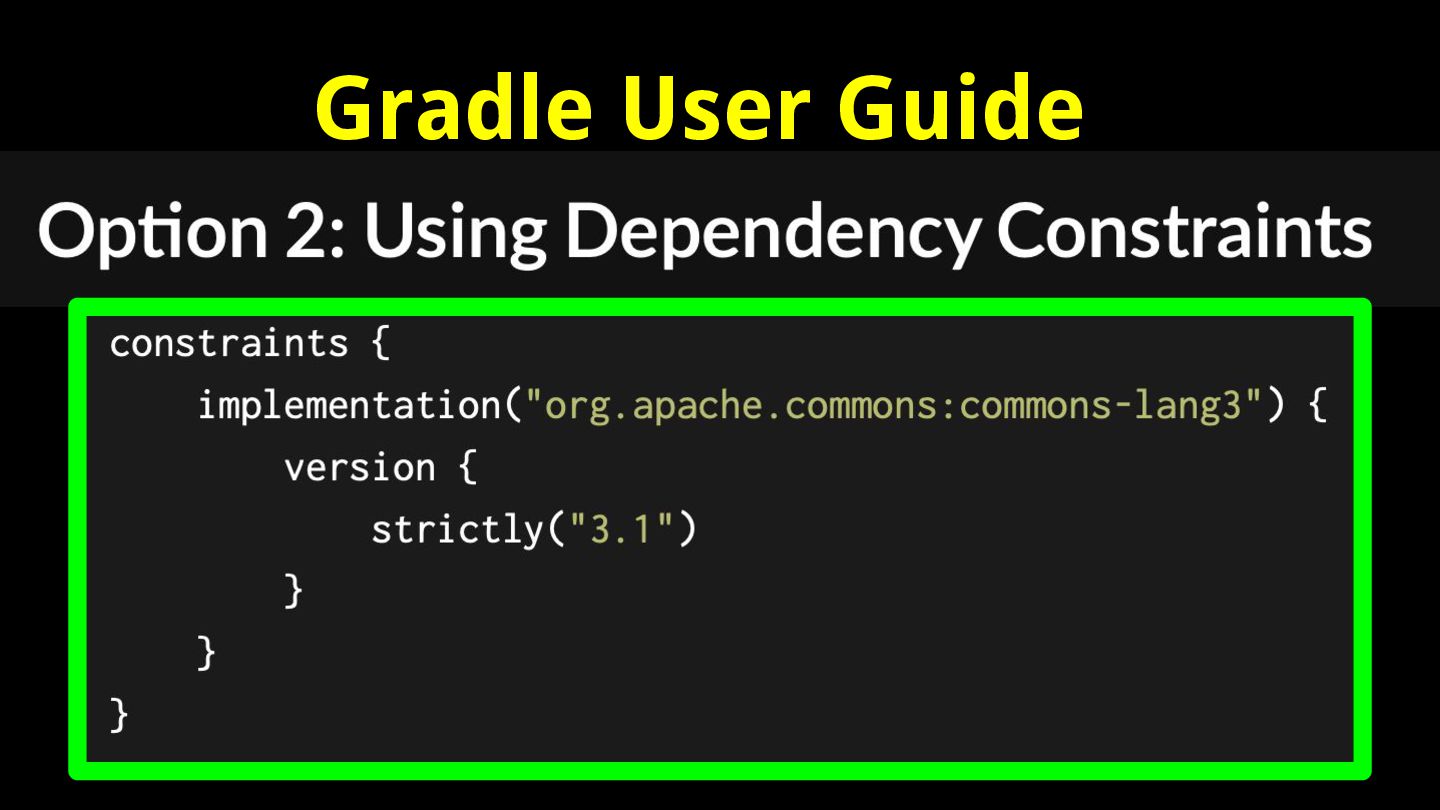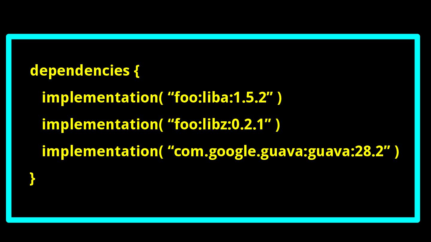 dependencies { implementation( “foo:liba:1.5.2” ) implementation( “foo:libz:0.2.1” ) implementation( “com.google.guava:guava:28.2”