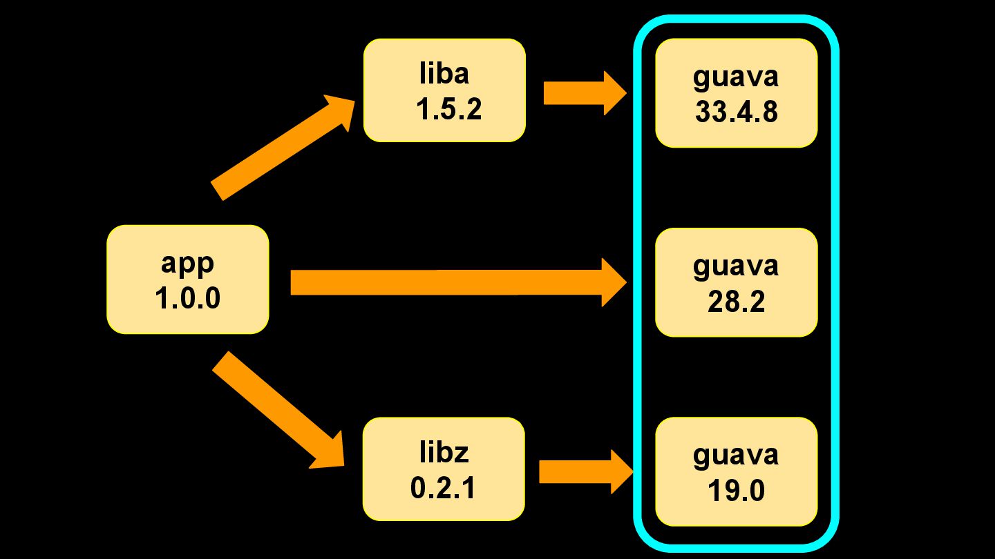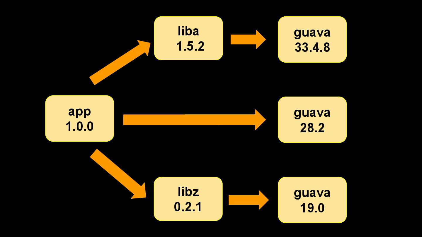 Maven: “nearest wins” Gradle: “highest version wins” guava 28.2 guava