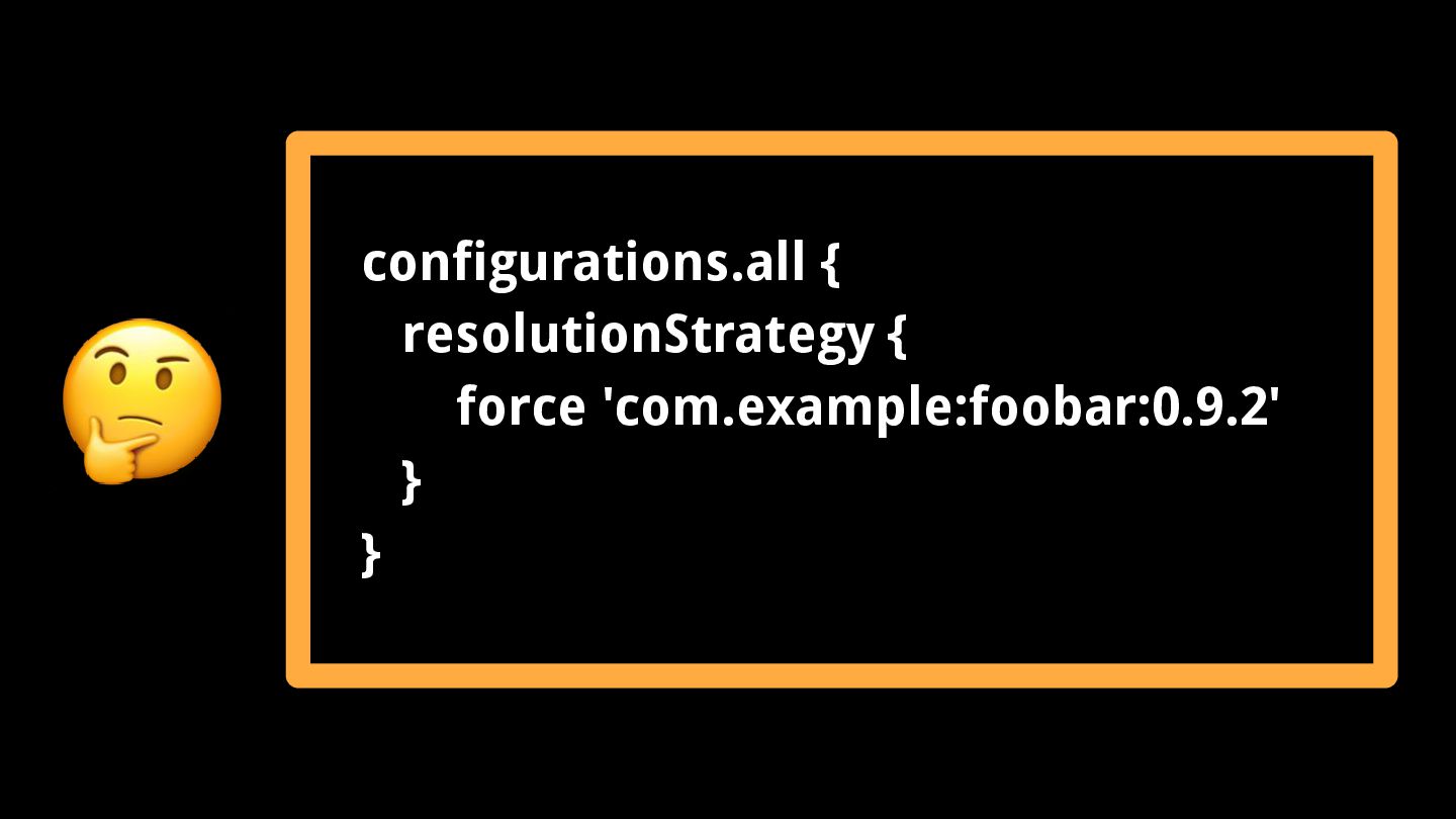 configurations.all { resolutionStrategy { force 'com.example:foobar:0.9.2' } }