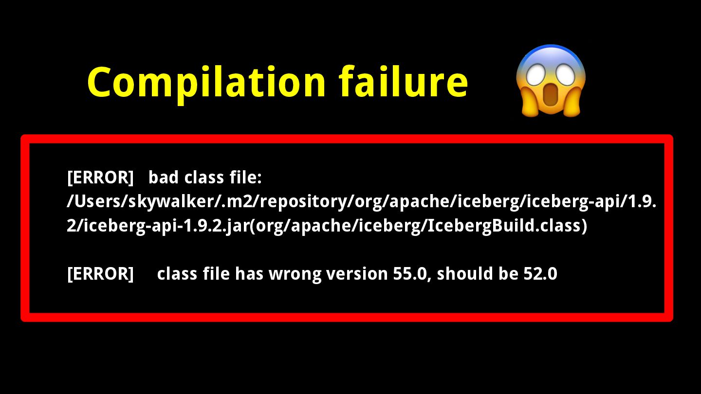 Compilation failure [ERROR] bad class file: /Users/skywalker/.m2/repository/org/apache/iceberg/iceberg-api/1.9. 2/iceberg-api-1.9.2.jar(org/apache/iceberg/IcebergBuild.class) [ERROR] class