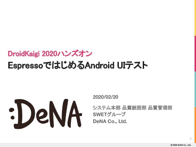 ⓒ 2020 DeNA Co., Ltd. 2-2. EspressoとAppiumの比較④ (参考) Appiumを選択する場合 パフォーマンス向上策の参考記事 • Appium Pro #50 (Android向け) Special Capabilities for Speeding up Android Test Initialization https://appiumpro.com/editions/50 • Appium Pro #77 (iOS向け) Optimizing WebDriverAgent Startup Performance https://appiumpro.com/editions/77 50