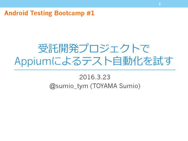 受託開発プロジェクトで Appiumによるテスト⾃動化を試す 2016.3.23 @sumio_tym (TOYAMA Sumio) 1 Android Testing Bootcamp