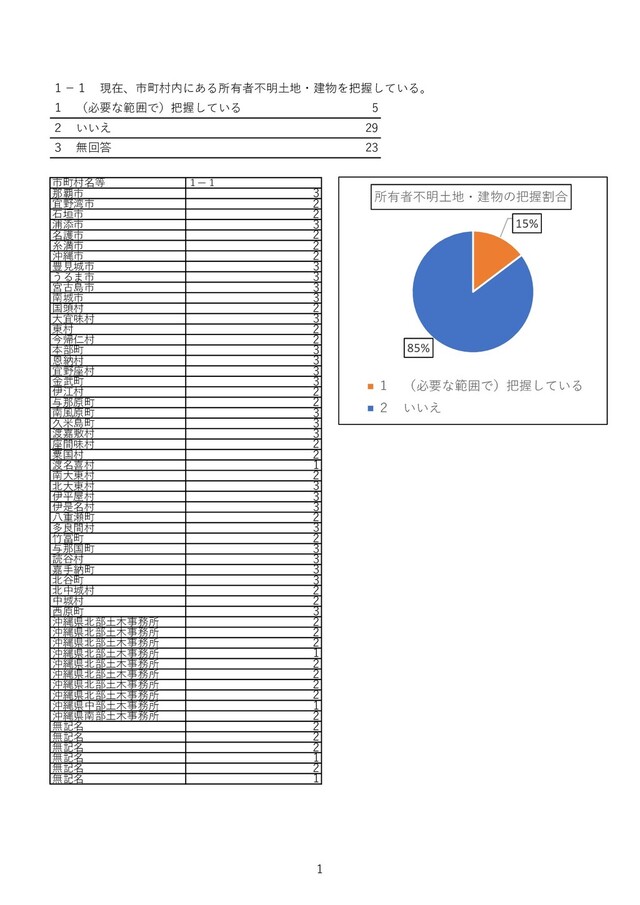 1-1 現在、市町村内にある所有者不明土地・建物を把握している。 1 (必要な範囲で)把握している 5 2 いいえ 29 3 無回答 23 市町村名等 1ー1 那覇市