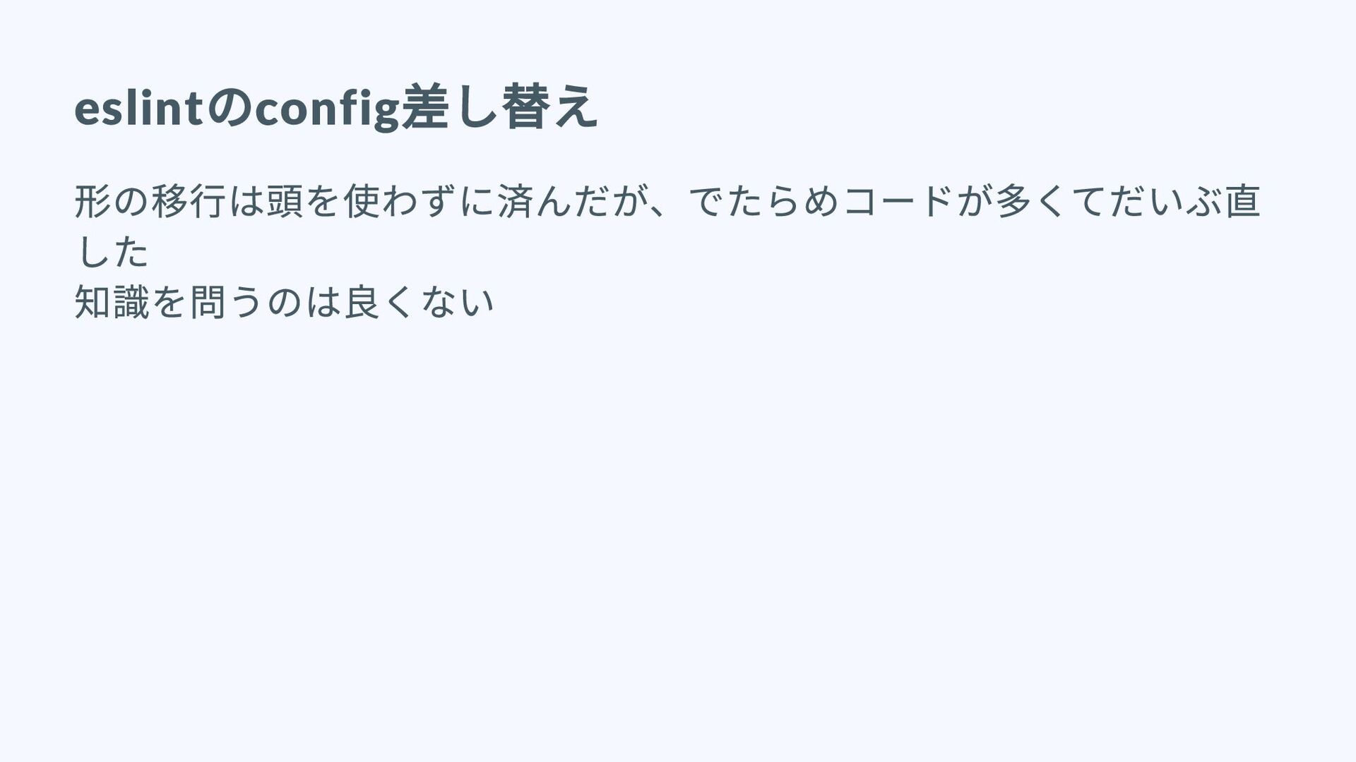 eslint のconfig 差し替え 形の移行は頭を使わずに済んだが、でたらめコードが多くてだいぶ直 した 知識を問うのは良くない