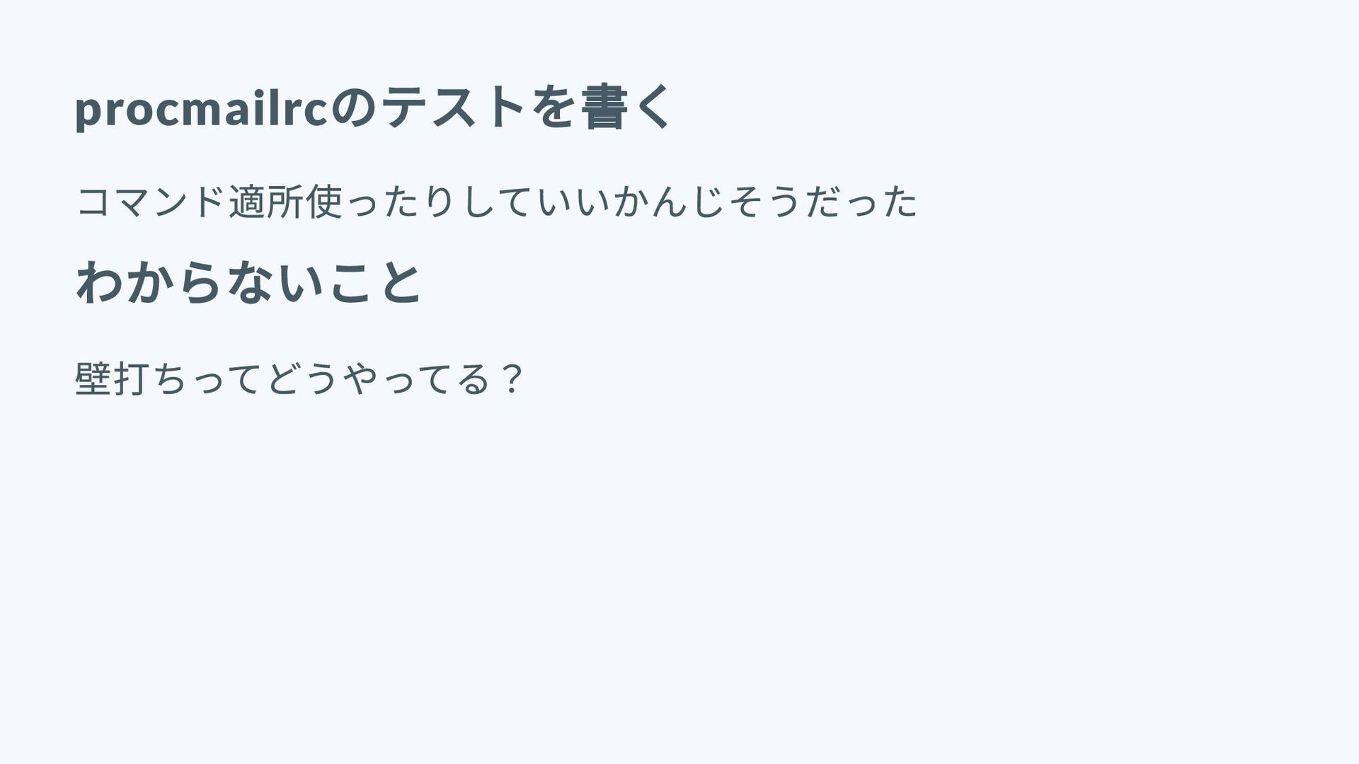 procmailrc のテストを書く コマンド適所使ったりしていいかんじそうだった わからないこと 壁打ちってどうやってる?