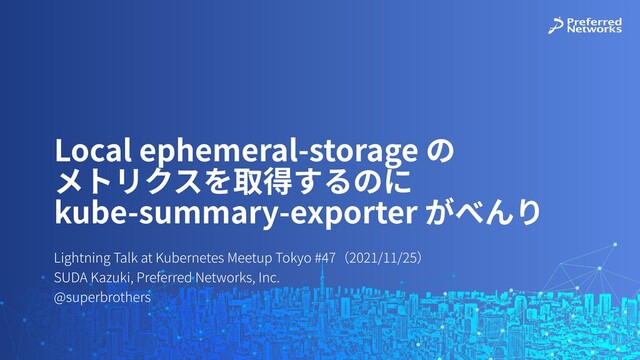 だけど、どちらも Local ephemeral-storage に関するメトリクスを提供してくれてない😣 ▶ Kubernetes は、ノードが DiskPressure になると、追い出す Pod を選ぶ際に 各 Pod がどのくらい Local ephemeral-storage を使⽤しているかの情報を使っているので、 どこぞから Local ephemeral-storage のメトリクスが取得できるはず Kubelet Summary API 6 !"#$%&'()*+,*-./0(+12345678 &&9:&;!<=>?$!&?!@>!<%<&A3BCDEFGHIJKL) &&M:&N=O&P?#=?#%Q&HRL &&S:&3BCDEFGHTL
