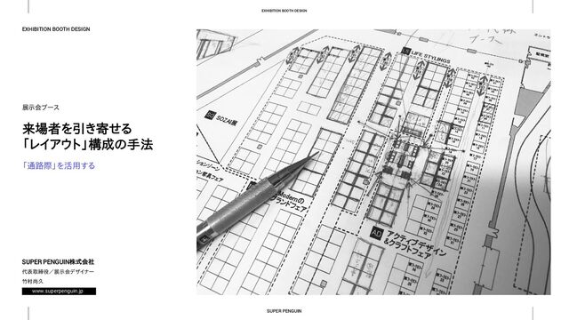 展示会ブースのレイアウト検討時に活用するスライド。 展示会ブース検討時にはまず「通路際」に展示台を置くことが重要です。 ほとんどの出展社は不用意に出展者につかまりたくない、と考えているもの。 ブースの奥の方に展示台を置いておくと、来場者は寄ってこなくなります。 本スライドは、レイアウト時の検討のポイントを解説しています。