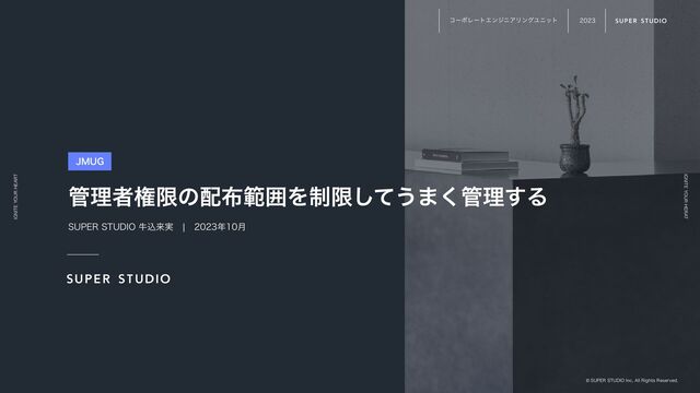 +BNG1SP͸ίʔϙϨʔτΤϯδχΞϦϯάϢχοτɾηΩϡϦςΟάϧʔϓɾ૯຿Ϣχοτͱ෦ॺΛԣஅͯ͠ӡ༻ w &%3ΛಋೖࡁΈ w ηΩϡϦςΟڧԽͷͨΊ w ηϧϑαʔϏεΛ׆༻͠ɺڐՄΛग़ͨ͠ΞϓϦέʔγϣϯͷΈΠϯετʔϧͰ͖ΔΑ͏ʹઃఆ ඞཁҎ্ʹݖݶΛ෇༩ͨ͘͠ͳ͍ ˡ࣮ࡍͷฐࣾηϧϑαʔϏε $IBUXPSL΍'JHNBͳͲۀ຿্ඞཁෆՄܽͳ΋ͷ͔Βɺ$MJQZ ͳͲͷۀ຿ޮ཰ԽͷͨΊͷπʔϧ΋༻ҙ %PDLFS΍$PNQPTFSͳͲ࢖༻͢Δ෦ॺ͕ݶΒΕΔ΋ͷ͸ 4DPQFͰΠϯετʔϧͰ͖Δ෦ॺΛ੍ݶ