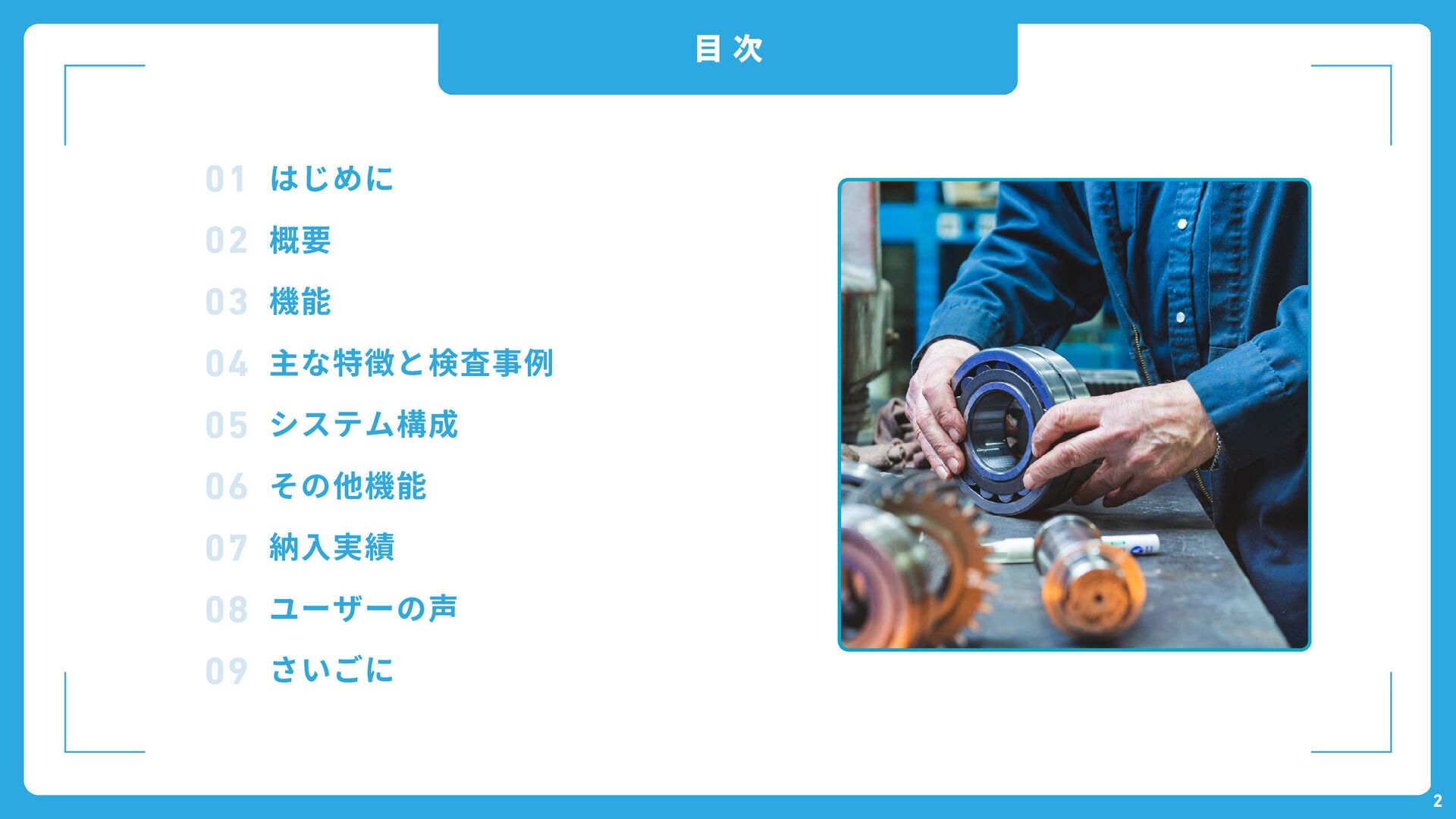 目 次 はじめに 概要 機能 主な特徴と検査事例 システム構成 その他機能 納入実績 ユーザーの声