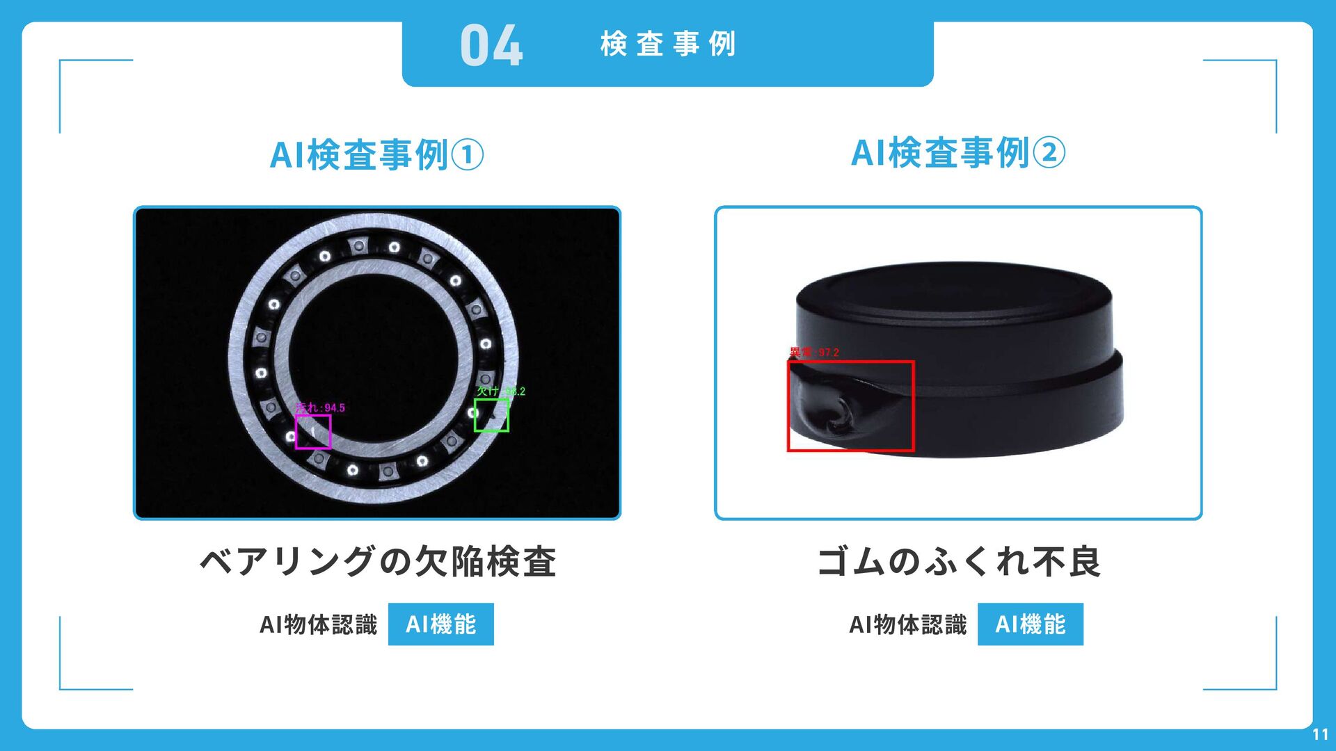 AI物体認識 ベアリングの欠陥検査 ゴムのふくれ不良 検 査 事 例 AI検査事例① AI検査事例② 04