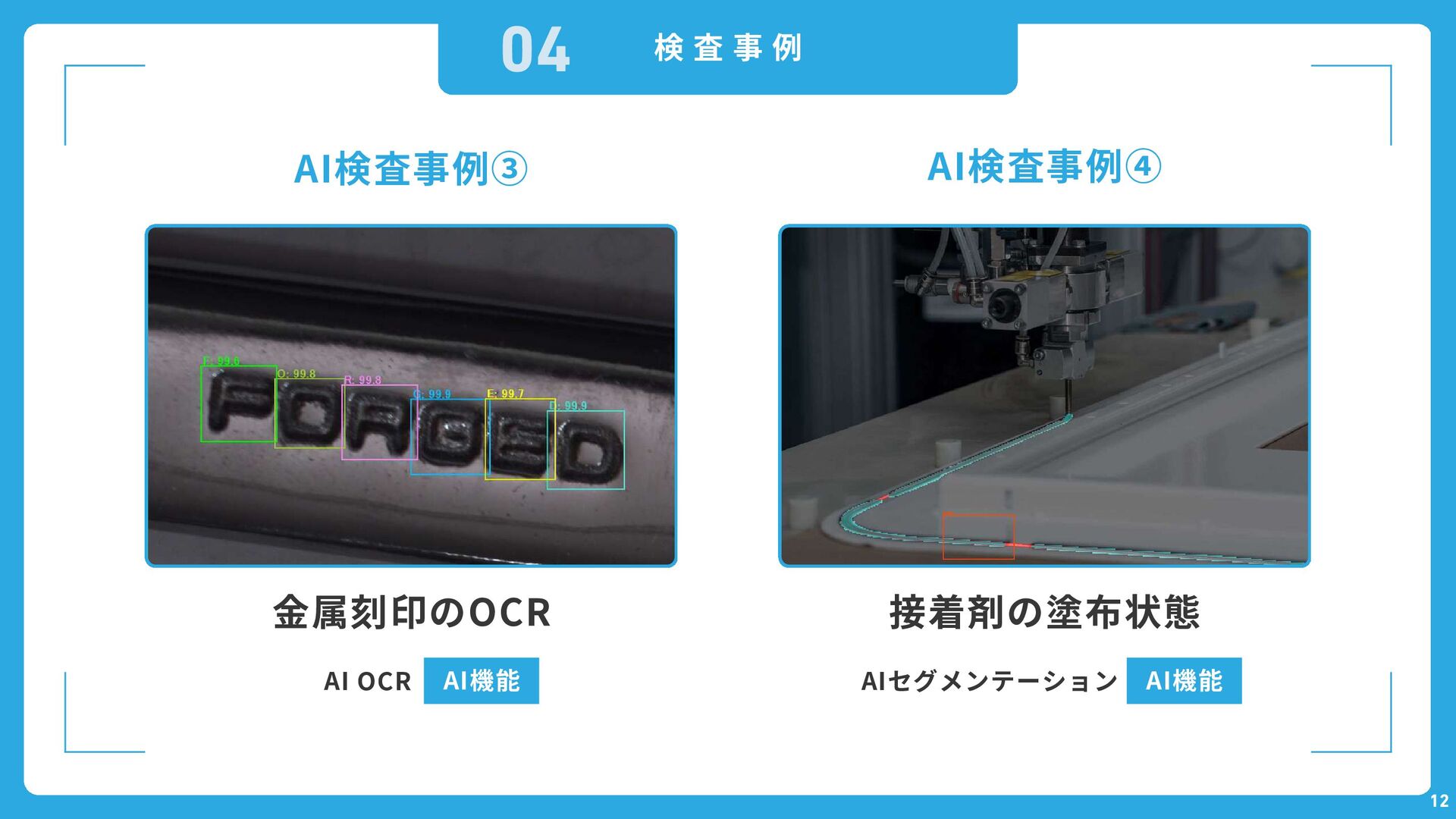 金属刻印のOCR 接着剤の塗布状態 検 査 事 例 AI検査事例③ AI検査事例④ 04 AI
