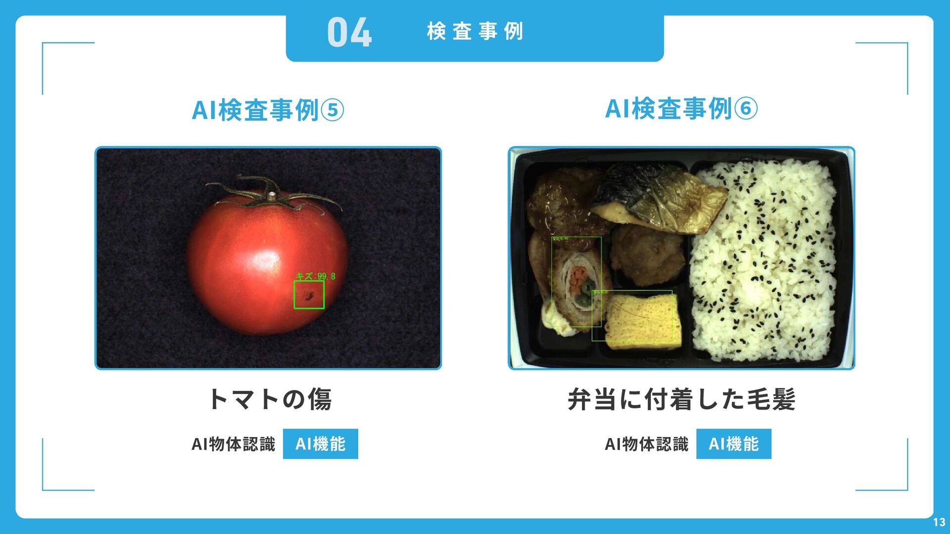 トマトの傷 弁当に付着した毛髪 検 査 事 例 AI検査事例⑤ AI検査事例⑥ 04 AI物体認識