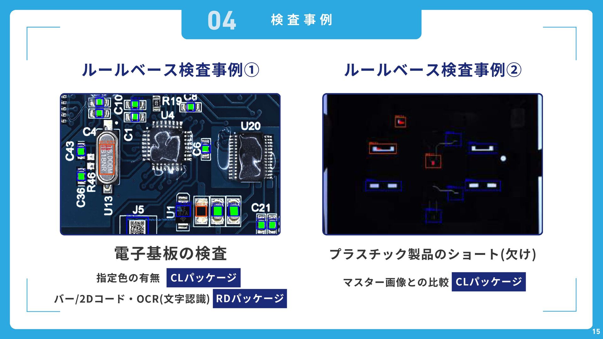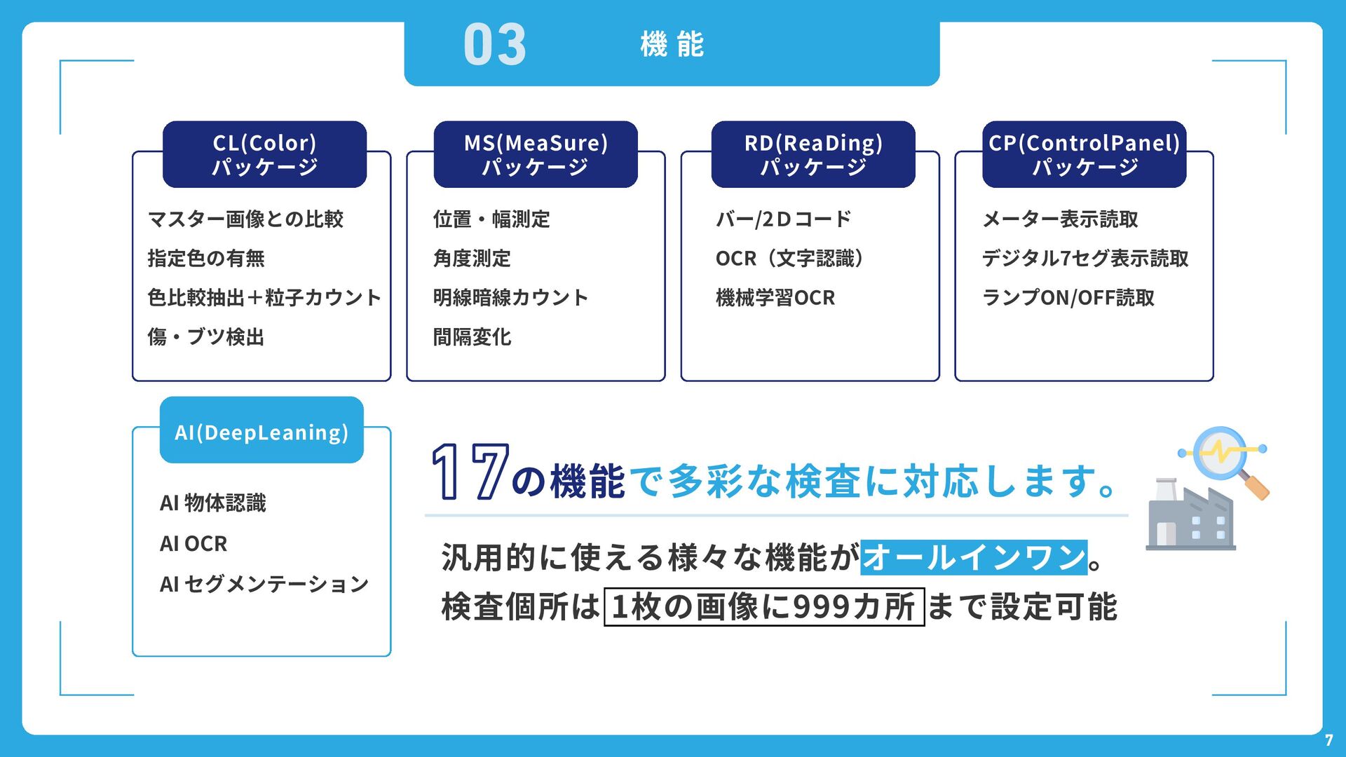 RD(ReaDing) CP(ControlPanel) AI(DeepLeaning) マスター画像との比較 指定色の有無 色比較抽出+粒子カウント 傷・ブツ検出 位置・幅測定 角度測定 明線暗線カウント 間隔変化 バー/2Dコード OCR(文字認識) 機械学習OCR メーター表示読取 デジタル7セグ表示読取 ランプON/OFF読取 AI 物体認識 AI OCR AI セグメンテーション 03 パッケージ パッケージ パッケージ パッケージ 7