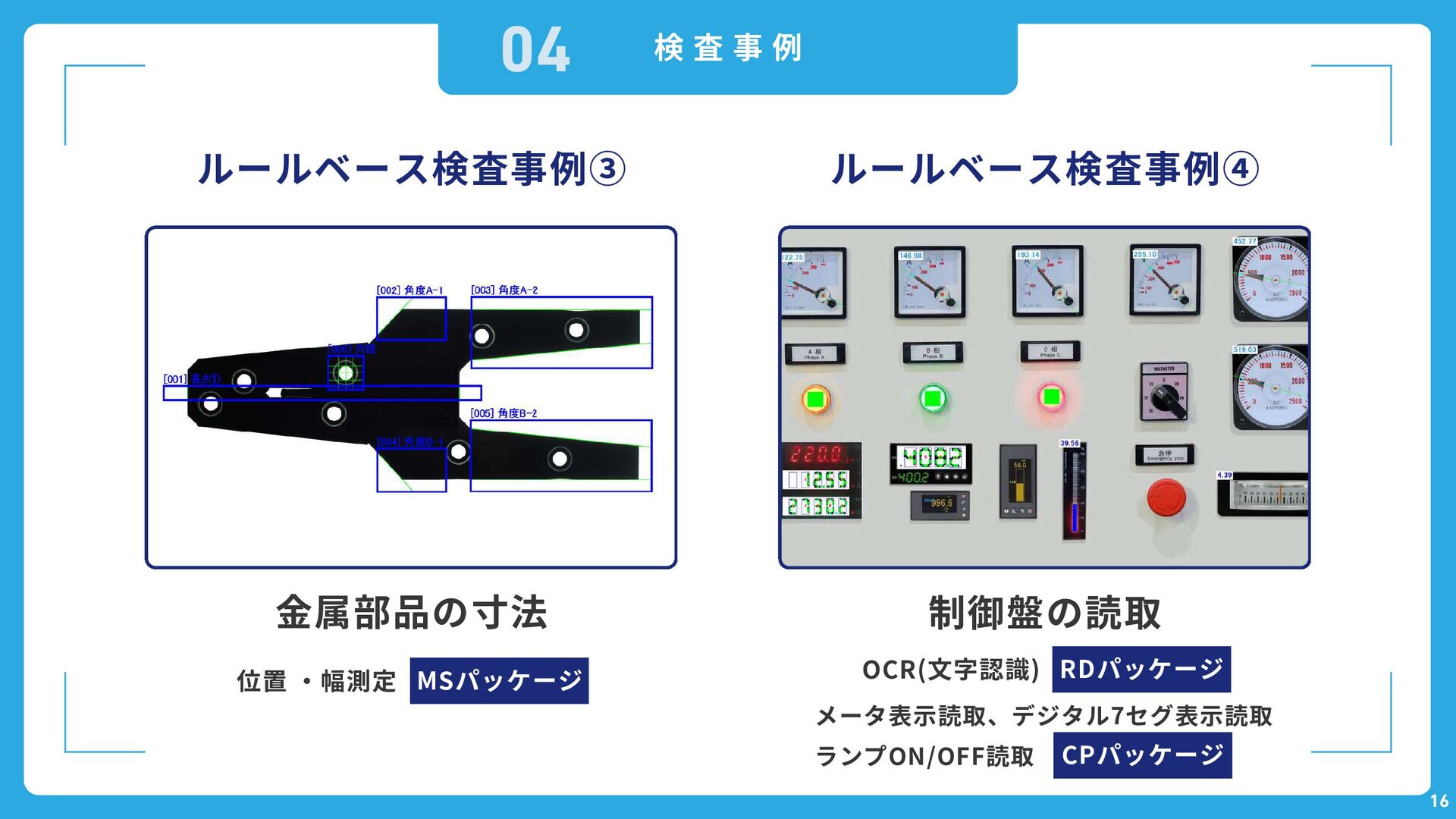 金属部品の寸法 制御盤の読取 検 査 事 例 ルールベース検査事例③ ルールベース検査事例④ 04 位置