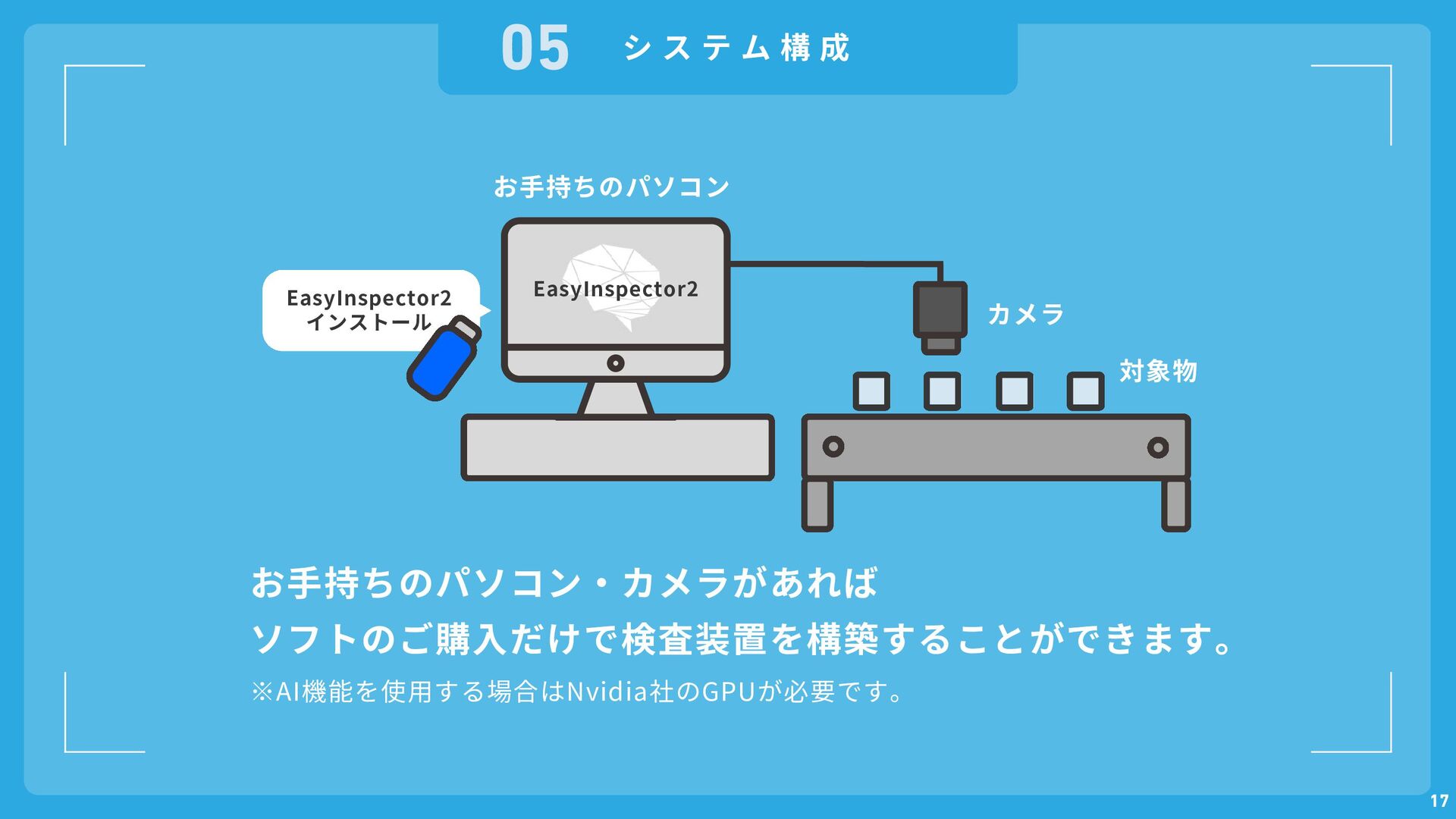 お手持ちのパソコン 05 カメラ 対象物 ※AI機能を使用する場合はNvidia社のGPUが必要です。 EasyInspector2 17
