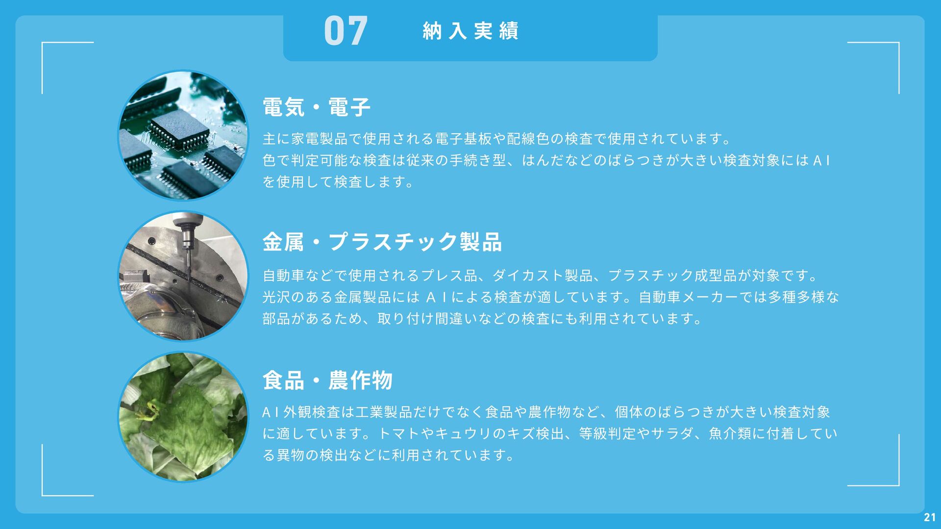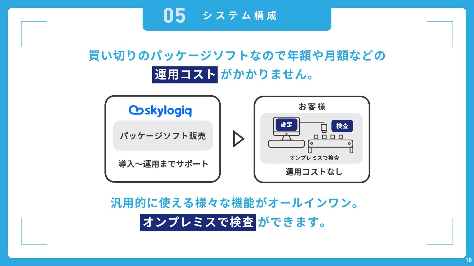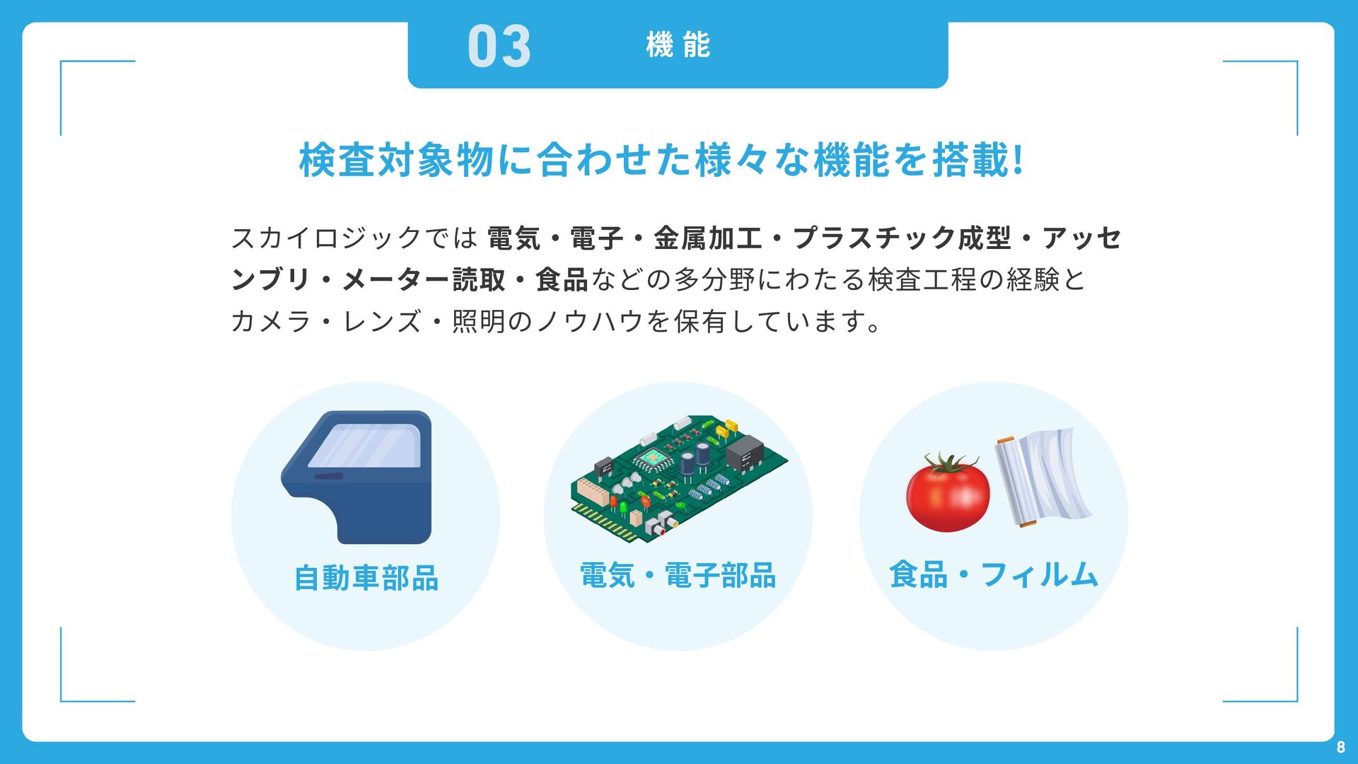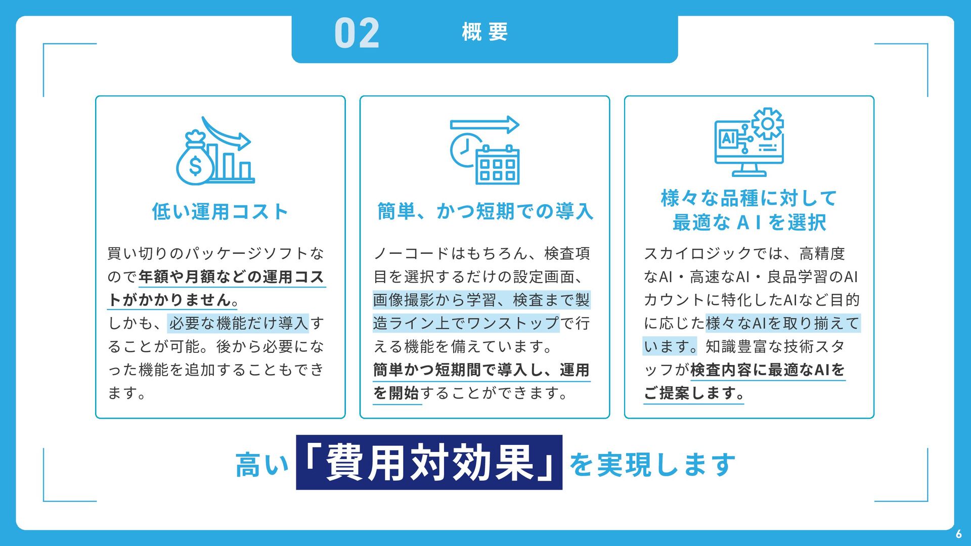 造ライン上でワンストップで行 える機能を備えています。 簡単かつ短期間で導入し、運用 を開始することができます。 高い を実現します 「費用対効果」 低い運用コスト 簡単、かつ短期での導入 様々な品種に対して 最適な A I を選択 スカイロジックでは、高精度 なAI・高速なAI・良品学習のAI カウントに特化したAIなど目的 に応じた様々なAIを取り揃えて います。知識豊富な技術スタ ッフが検査内容に最適なAIを ご提案します。 概 要 02 6