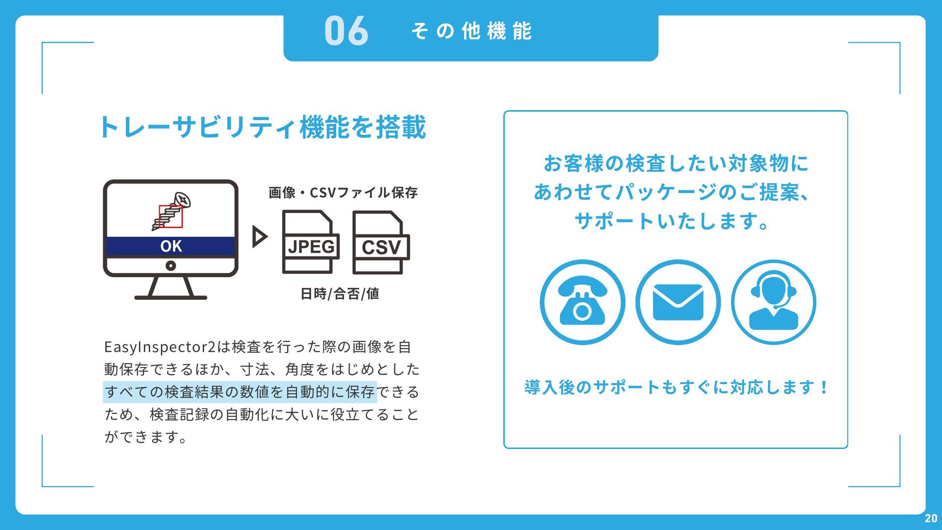 06 OK 画像・CSVファイル保存 日時/合否/値 EasyInspector2は検査を行った際の画像を自 動保存できるほか、寸法、角度をはじめとした すべての検査結果の数値を自動的に保存できる ため、検査記録の自動化に大いに役立てること ができます。 20