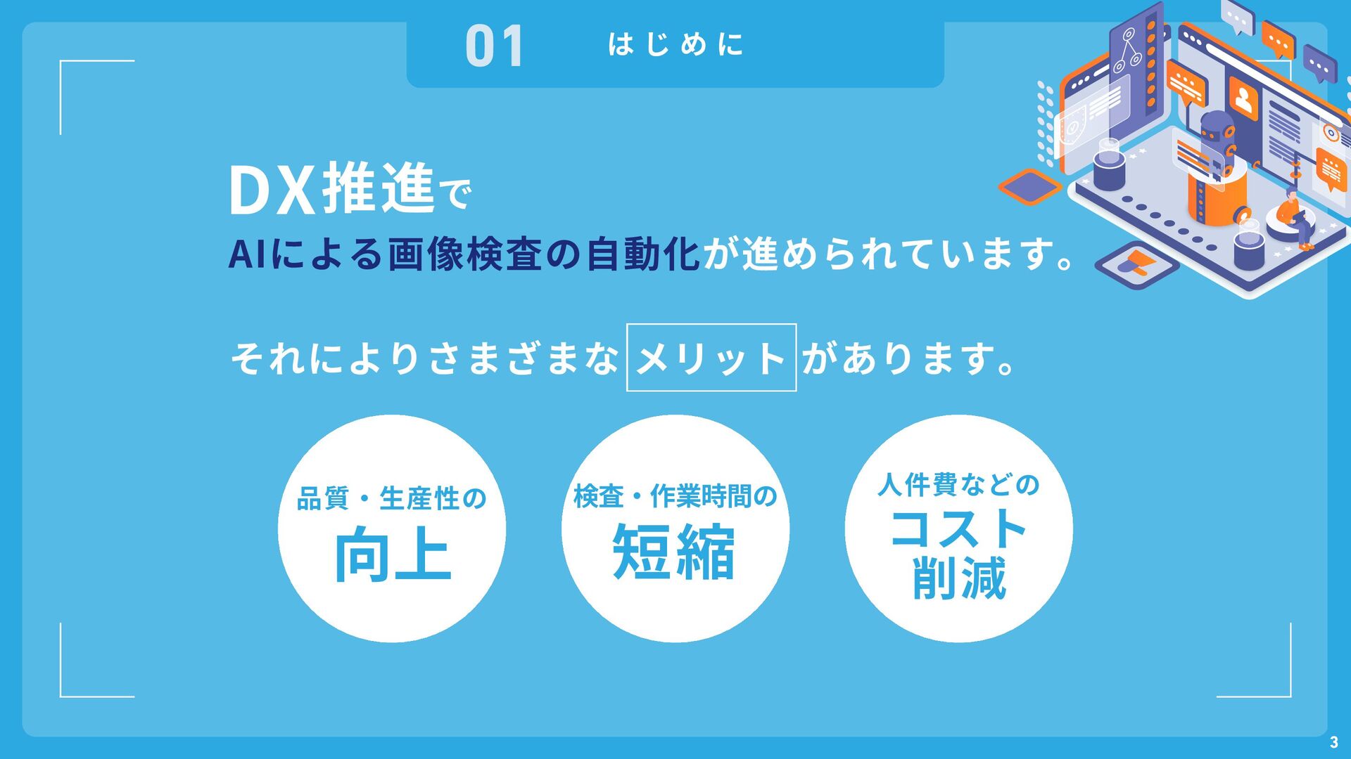 品質・生産性の 向上 検査・作業時間の 短縮 人件費などの コスト 削減 で AIによる画像検査の自動化が進められています。 それによりさまざまな