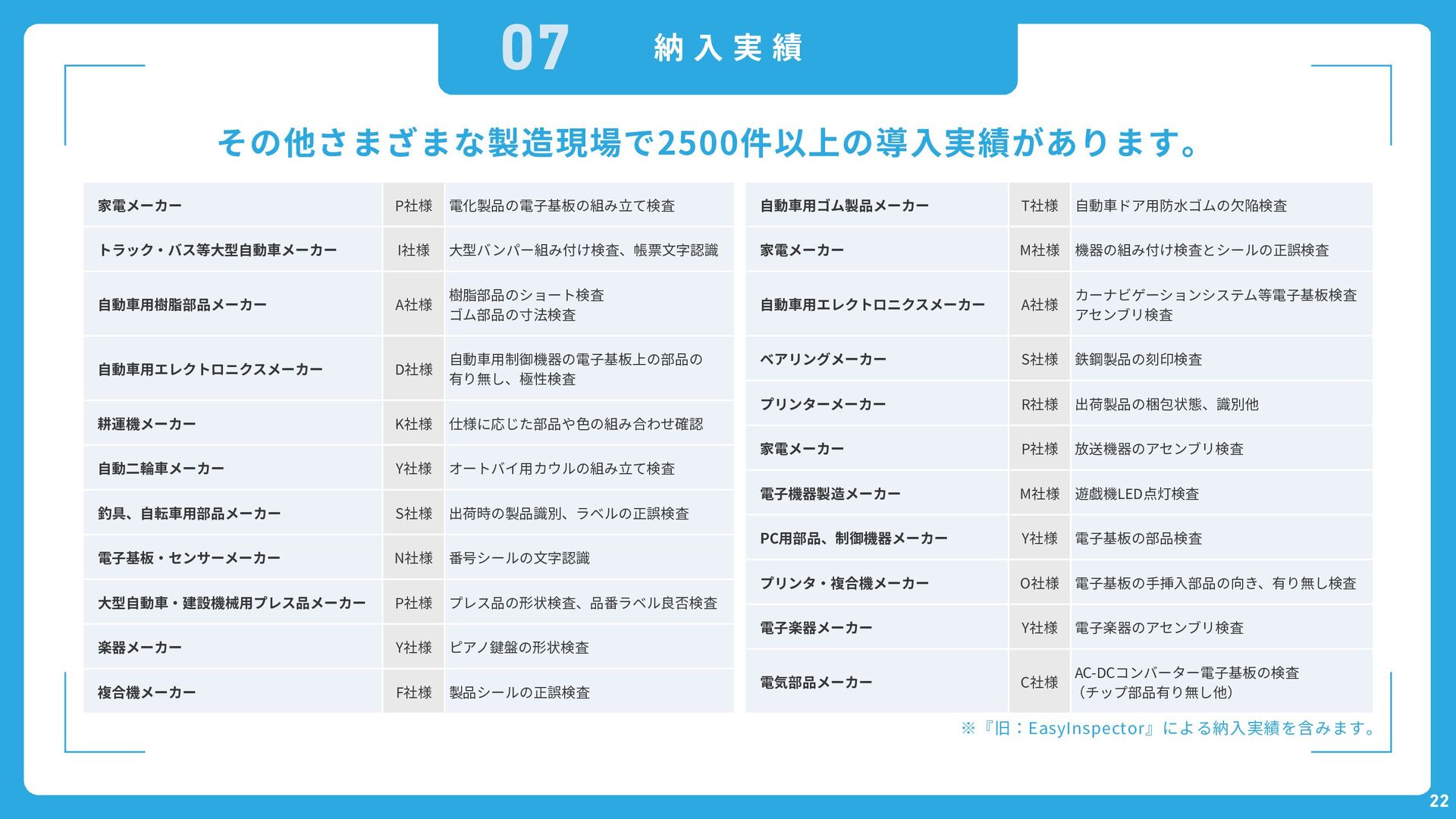自動車用エレクトロニクスメーカー D社様 自動車用制御機器の電子基板上の部品の 有り無し、極性検査 耕運機メーカー K社様 仕様に応じた部品や色の組み合わせ確認 自動二輪車メーカー Y社様 オートバイ用カウルの組み立て検査 釣具、自転車用部品メーカー S社様 出荷時の製品識別、ラベルの正誤検査 電子基板・センサーメーカー N社様 番号シールの文字認識 大型自動車・建設機械用プレス品メーカー P社様 プレス品の形状検査、品番ラベル良否検査 楽器メーカー Y社様 ピアノ鍵盤の形状検査 複合機メーカー F社様 製品シールの正誤検査 自動車用ゴム製品メーカー T社様 自動車ドア用防水ゴムの欠陥検査 家電メーカー M社様 機器の組み付け検査とシールの正誤検査 自動車用エレクトロニクスメーカー A社様 カーナビゲーションシステム等電子基板検査 アセンブリ検査 ベアリングメーカー S社様 鉄鋼製品の刻印検査 プリンターメーカー R社様 出荷製品の梱包状態、識別他 家電メーカー P社様 放送機器のアセンブリ検査 電子機器製造メーカー M社様 遊戯機LED点灯検査 PC用部品、制御機器メーカー Y社様 電子基板の部品検査 プリンタ・複合機メーカー O社様 電子基板の手挿入部品の向き、有り無し検査 電子楽器メーカー Y社様 電子楽器のアセンブリ検査 電気部品メーカー C社様 AC-DCコンバーター電子基板の検査 (チップ部品有り無し他) ※『旧:EasyInspector』による納入実績を含みます。 その他さまざまな製造現場で2500件以上の導入実績があります。 納 入 実 績 07 22