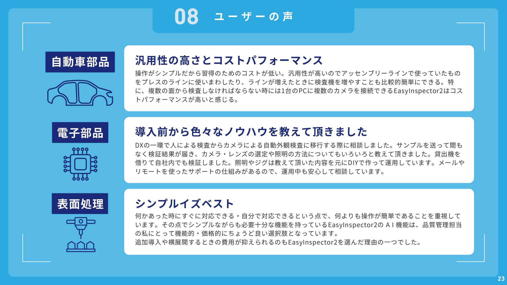 操作がシンプルだから習得のためのコストが低い。汎用性が高いのでアッセンブリーラインで使っていたもの をプレスのラインに使いまわしたり、ラインが増えたときに検査機を増やすことも比較的簡単にできる。特 に、複数の面から検査しなければならない時には1台のPCに複数のカメラを接続できるEasyInspector2はコス トパフォーマンスが高いと感じる。 導入前から色々なノウハウを教えて頂きました DXの一環で人による検査からカメラによる自動外観検査に移行する際に相談しました。サンプルを送って間も なく検証結果が届き、カメラ・レンズの選定や照明の方法についてもいろいろと教えて頂きました。貸出機を 借りて自社内でも検証しました。照明やジグは教えて頂いた内容を元にDIYで作って運用しています。メールや リモートを使ったサポートの仕組みがあるので、運用中も安心して相談しています。 シンプルイズベスト 何かあった時にすぐに対応できる・自分で対応できるという点で、何よりも操作が簡単であることを重視して います。その点でシンプルながらも必要十分な機能を持っているEasyInspector2の A I 機能は、品質管理担当 の私にとって機能的・価格的にちょうど良い選択肢となっています。 追加導入や横展開するときの費用が抑えられるのもEasyInspector2を選んだ理由の一つでした。 08 23
