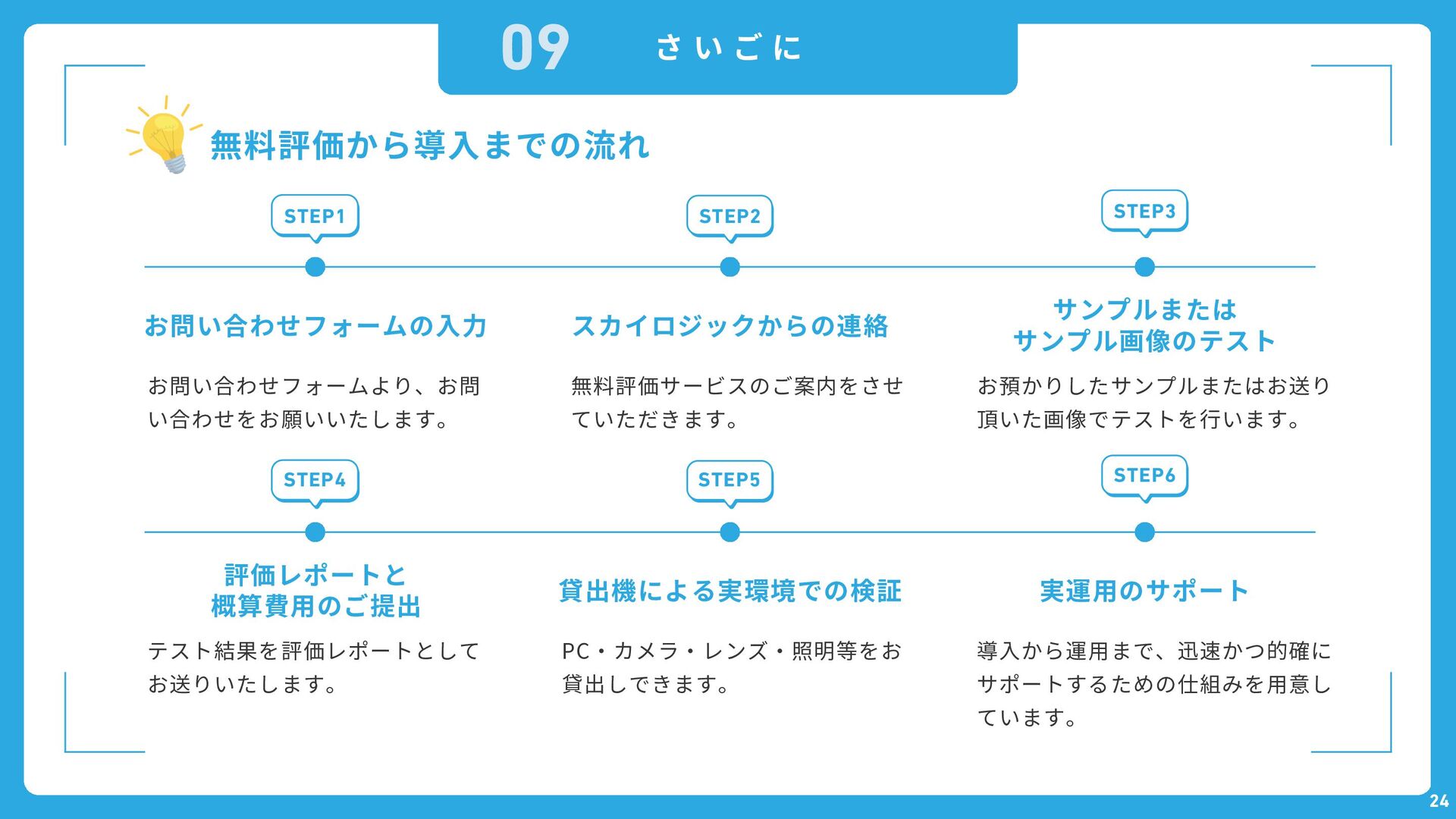 サンプル画像のテスト さ い ご に 無料評価から導入までの流れ STEP2 STEP3 テスト結果を評価レポートとして お送りいたします。 評価レポートと 概算費用のご提出 STEP4 PC・カメラ・レンズ・照明等をお 貸出しできます。 貸出機による実環境での検証 導入から運用まで、迅速かつ的確に サポートするための仕組みを用意し ています。 実運用のサポート STEP5 STEP6 09 24