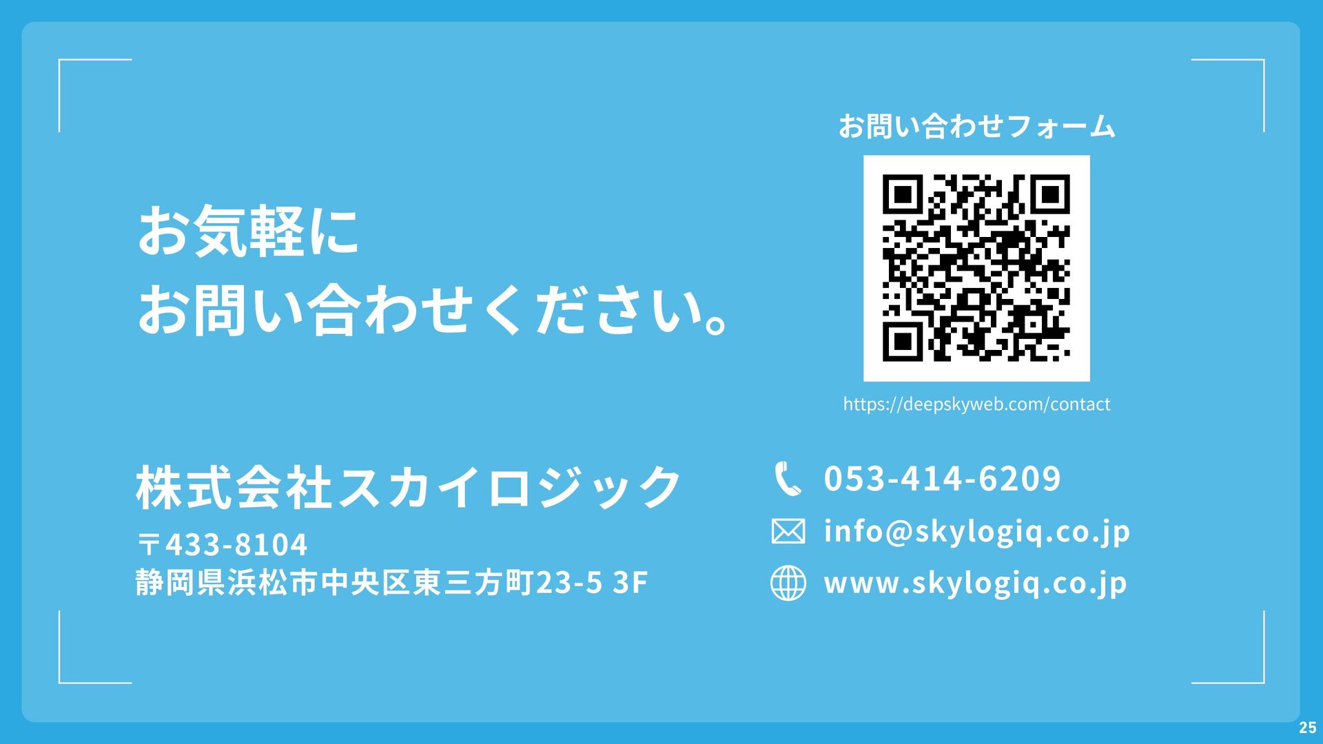 053-414-6209 https://deepskyweb.com/contact お問い合わせフォーム お気軽に お問い合わせください。 株式会社スカイロジック 〒433-8104 静岡県浜松市中央区東三方町23-5