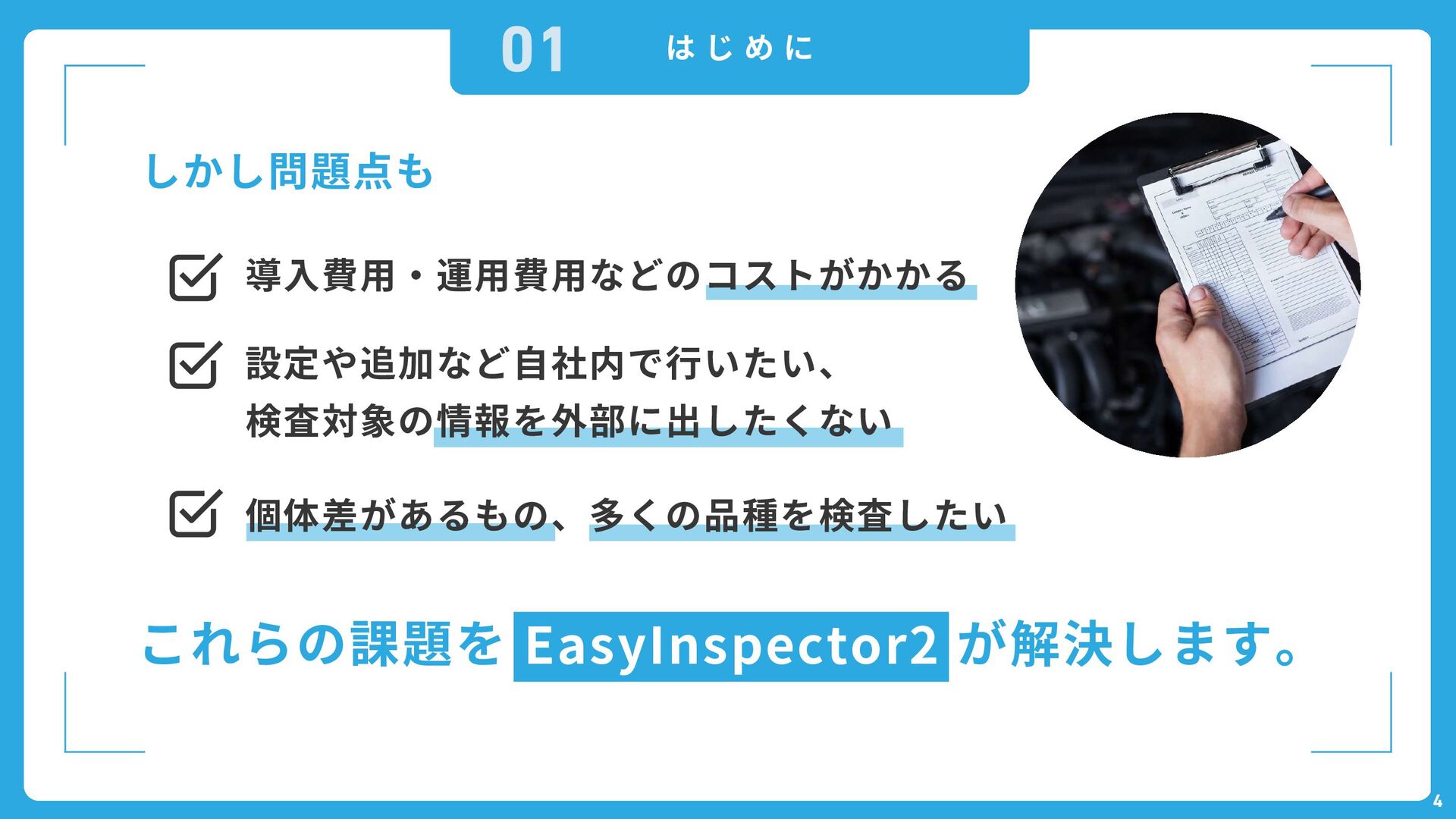 しかし問題点も これらの課題を が解決します。 01 は じ め に EasyInspector2 個体差があるもの、多くの品種を検査したい