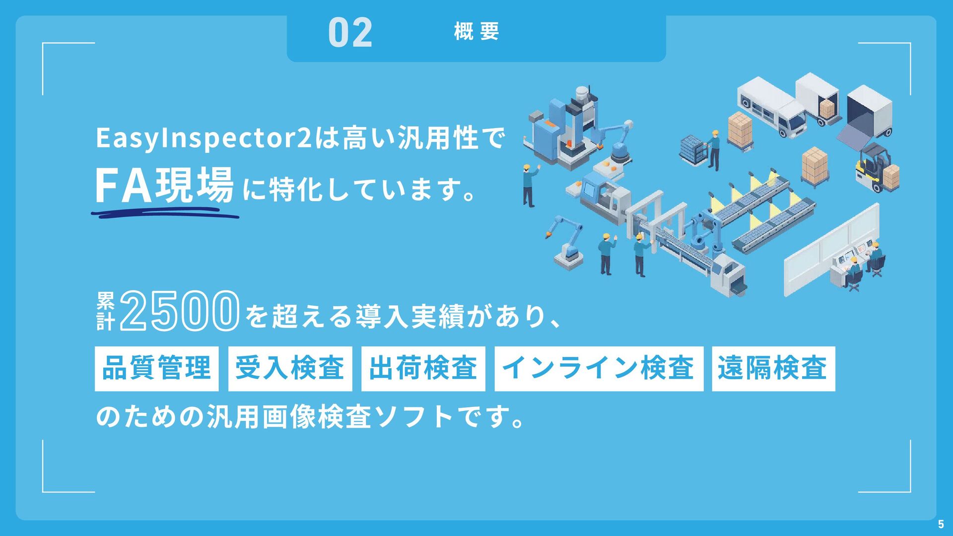を超える導入実績があり、 2500 EasyInspector2は高い汎用性で 概 要 02 に特化しています。 現場 FA 累