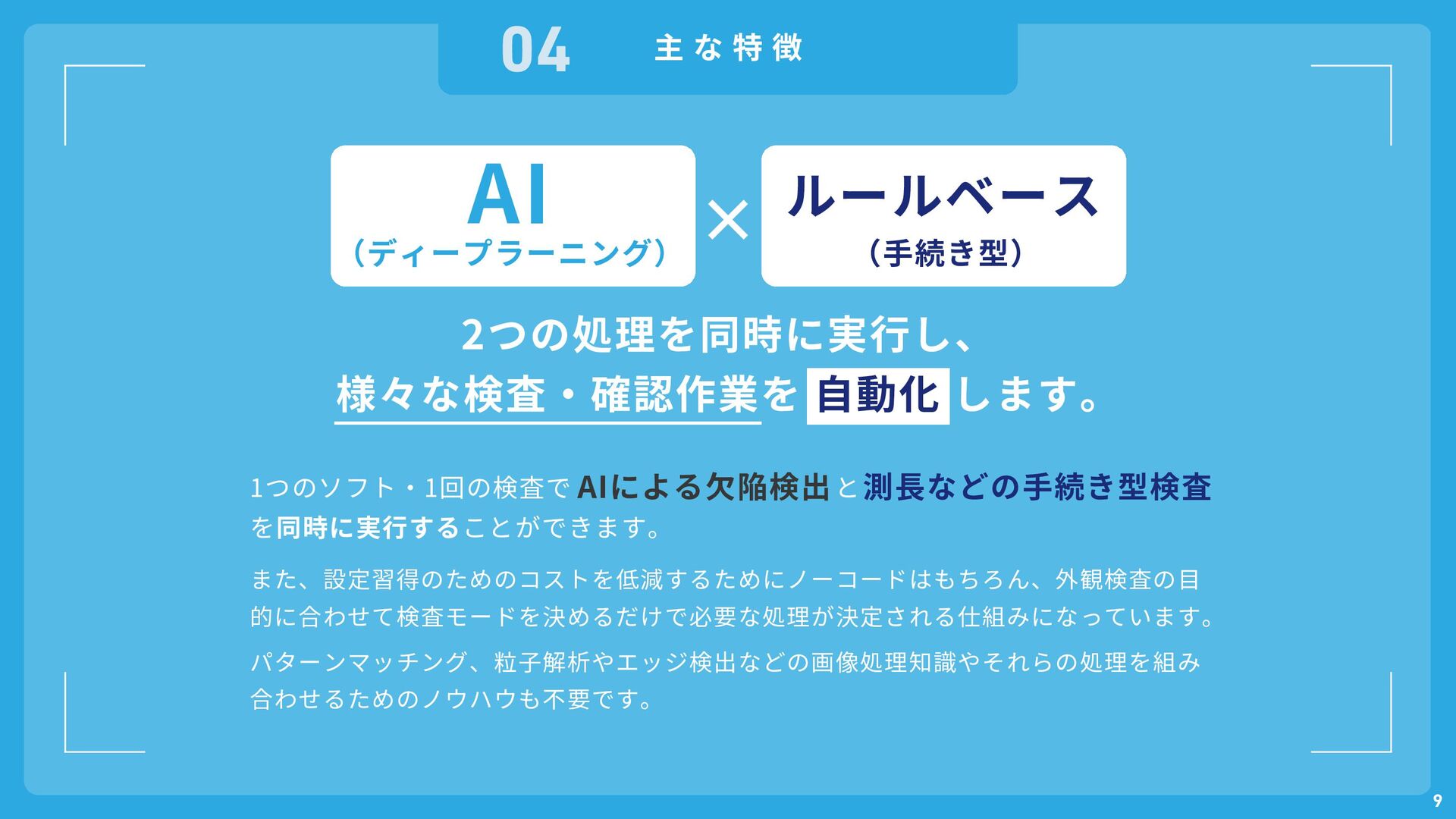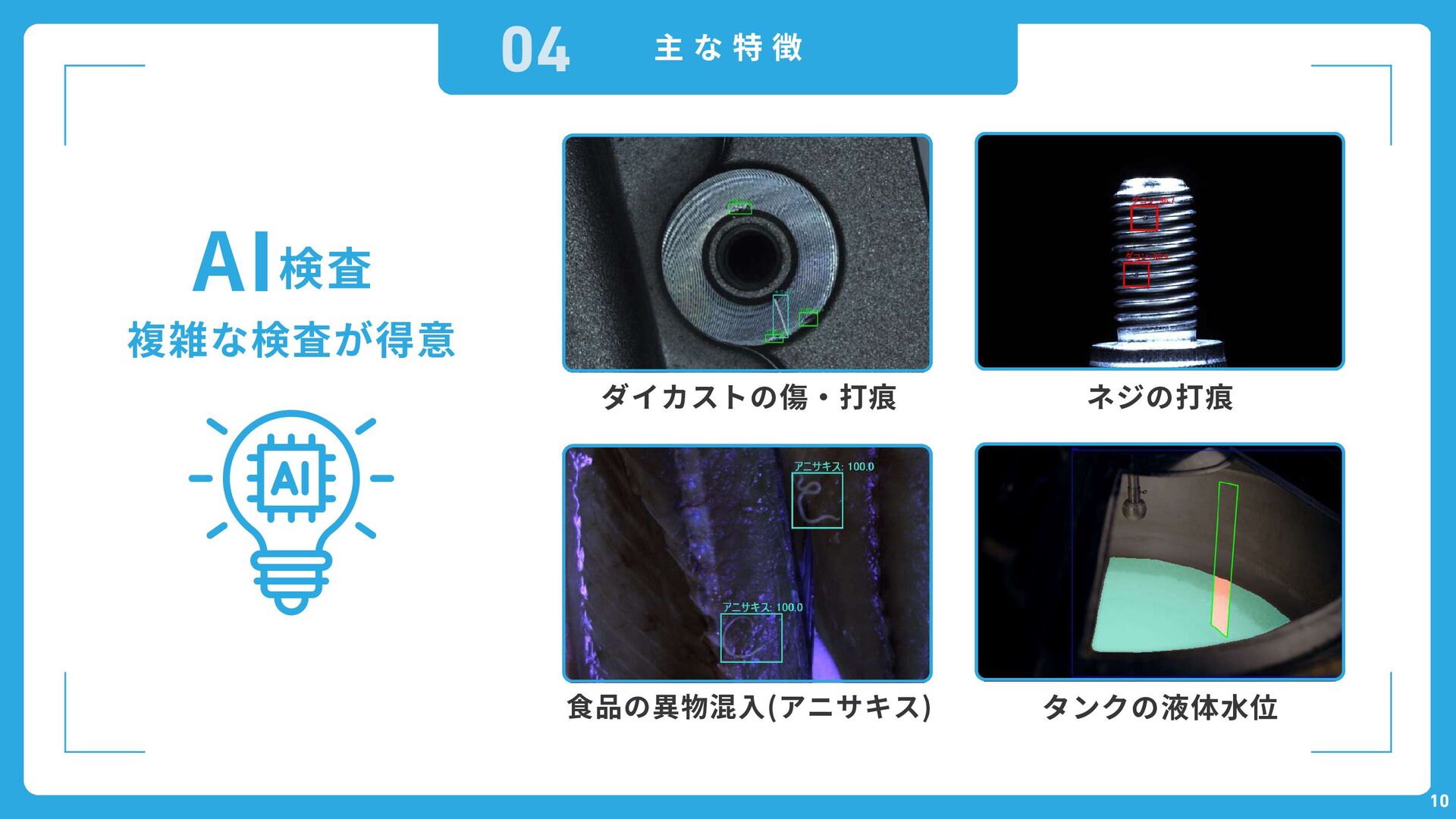 徴 04 ルールベース (手続き型) AI (ディープラーニング) × また、設定習得のためのコストを低減するためにノーコードはもちろん、外観検査の目 的に合わせて検査モードを決めるだけで必要な処理が決定される仕組みになっています。 AIによる欠陥検出 測長などの手続き型検査 パターンマッチング、粒子解析やエッジ検出などの画像処理知識やそれらの処理を組み 合わせるためのノウハウも不要です。 9