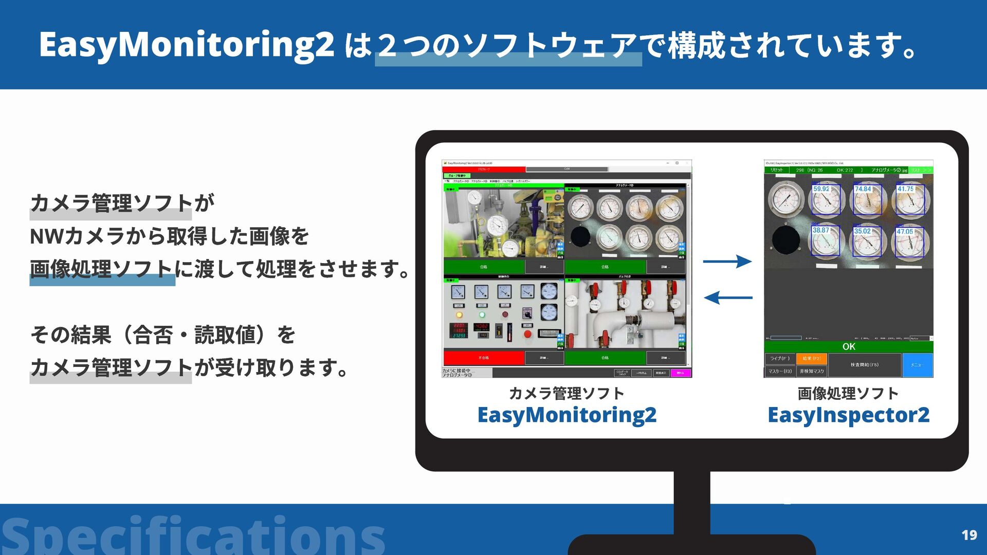 EasyMonitoring2 EasyMonitoring2 EasyInspector2 カメラ管理ソフトが NW カメラから取得した画像を 画像処理ソフトに渡して処理をさせます。 その結果(合否・読取値)を カメラ管理ソフトが受け取ります。 19