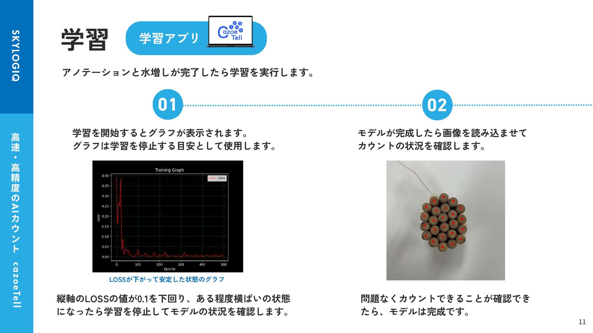 縦軸のLOSSの値が0.1を下回り、ある程度横ばいの状態 になったら学習を停止してモデルの状況を確認します。 LOSSが下がって安定した状態のグラフ 問題なくカウントできることが確認でき たら、モデルは完成です。 高 速 ・ 高 精 度 の AI カ ウ ン ト SKYLOGIQ cazoeTell 11