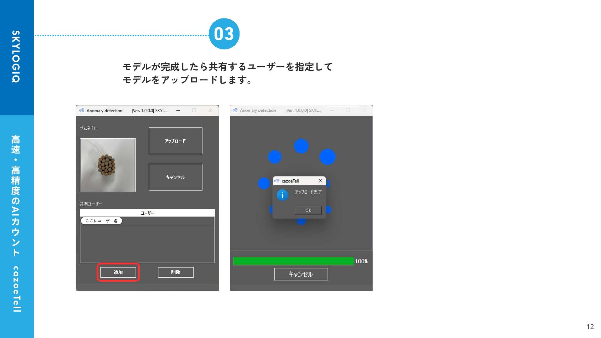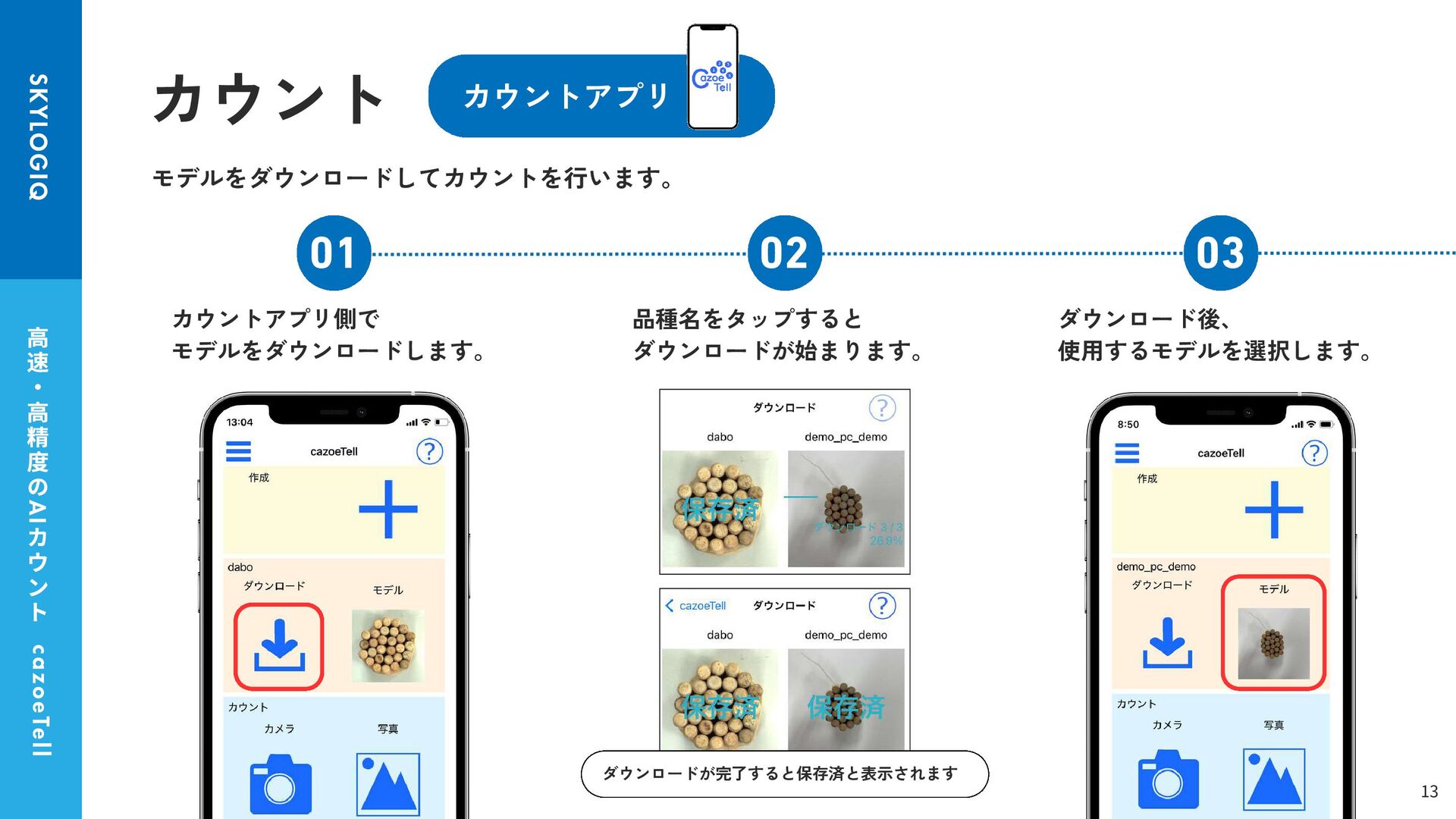 ダウンロードが始まります。 ダウンロード後、 使用するモデルを選択します。 ダウンロードが完了すると保存済と表示されます 高 速 ・ 高 精 度 の AI カ ウ ン ト SKYLOGIQ cazoeTell 13