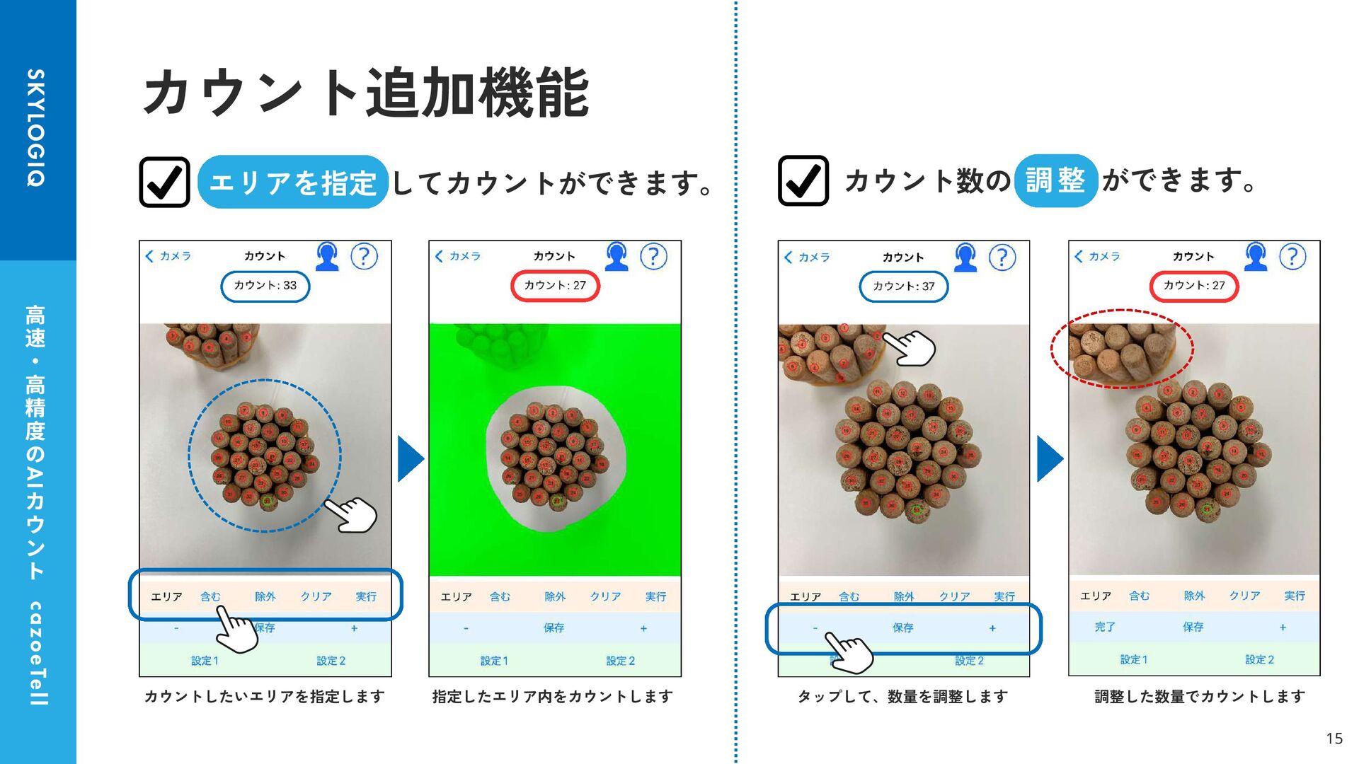 ウ ン ト SKYLOGIQ cazoeTell カウント数の してカウントができます。 エリアを指定 カウント追加機能 指定したエリア内をカウントします タップして、数量を調整します カウントしたいエリアを指定します 調整した数量でカウントします ができます。 調整 15