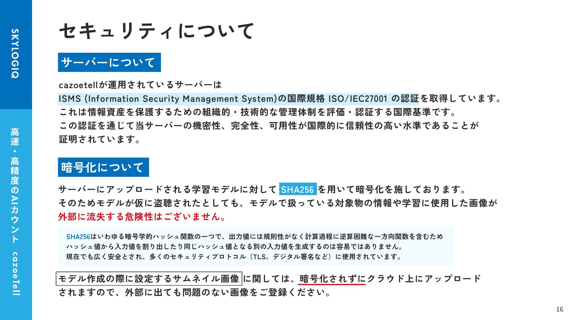 ウ ン ト SKYLOGIQ cazoeTell セキュリティについて 16 モデル作成の際に設定するサムネイル画像 に関しては、暗号化されずにクラウド上にアップロード されますので、外部に出ても問題のない画像をご登録ください。 サーバーにアップロードされる学習モデルに対して SHA256 を用いて暗号化を施しております。 そのためモデルが仮に盗聴されたとしても、モデルで扱っている対象物の情報や学習に使用した画像が 外部に流失する危険性はございません。 SHA256はいわゆる暗号学的ハッシュ関数の一つで、出力値には規則性がなく計算過程に逆算困難な一方向関数を含むため ハッシュ値から入力値を割り出したり同じハッシュ値となる別の入力値を生成するのは容易ではありません。 現在でも広く安全とされ、多くのセキュリティプロトコル(TLS、デジタル署名など)に使用されています。 cazoetellが運用されているサーバーは ISMS (Information Security Management System)の国際規格 ISO/IEC27001 の認証を取得しています。 これは情報資産を保護するための組織的・技術的な管理体制を評価・認証する国際基準です。 この認証を通じて当サーバーの機密性、完全性、可用性が国際的に信頼性の高い水準であることが 証明されています。 サーバーについて 暗号化について