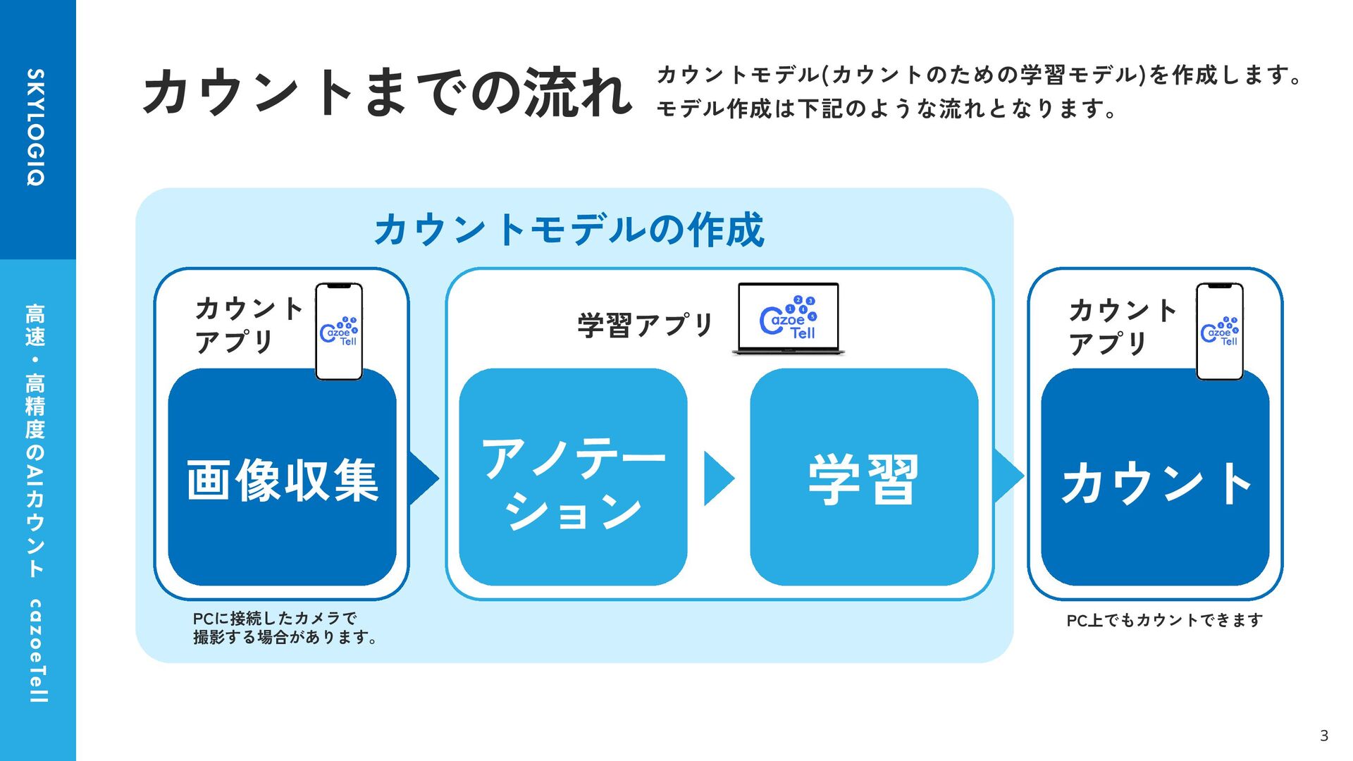 画像収集 PCに接続したカメラで 撮影する場合があります。 カウント アノテー ション 学習 高 速 ・ 高 精 度 の AI カ ウ ン ト SKYLOGIQ cazoeTell 3