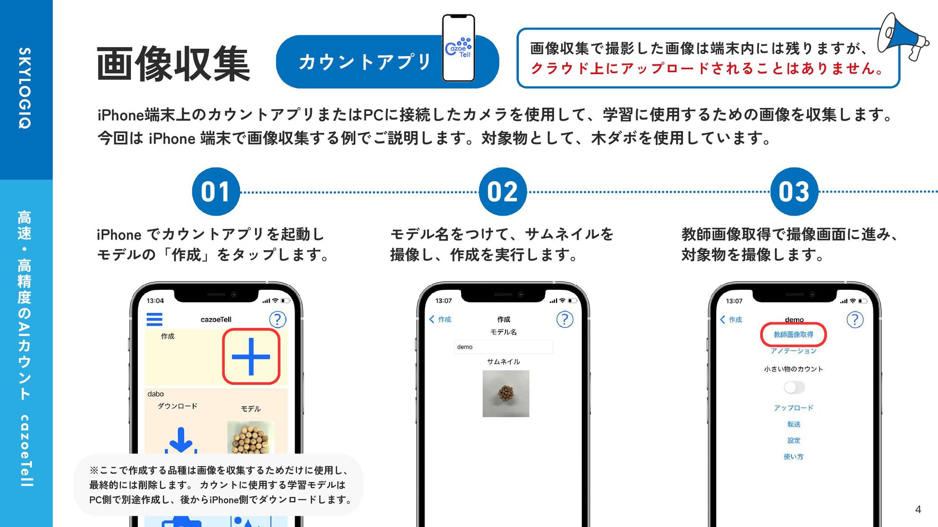 最終的には削除します。 カウントに使用する学習モデルは PC側で別途作成し、後からiPhone側でダウンロードします。 cazoeTell iPhone でカウントアプリを起動し モデルの「作成」をタップします。 モデル名をつけて、サムネイルを 撮像し、作成を実行します。 教師画像取得で撮像画面に進み、 対象物を撮像します。 高 速 ・ 高 精 度 の AI カ ウ ン ト SKYLOGIQ cazoeTell 4 画像収集で撮影した画像は端末内には残りますが、 クラウド上にアップロードされることはありません。