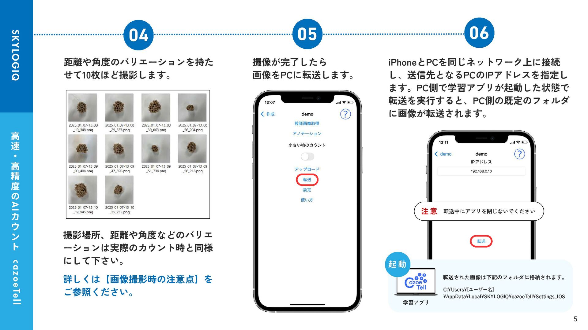 に画像が転送されます。 撮像が完了したら 画像をPCに転送します。 転送された画像は下記のフォルダに格納されます。 C:\Users\[ユーザー名] \AppData\Local\SKYLOGIQ\cazoeTell\Settings_IOS 学習アプリ 起 動 注 意 転送中にアプリを閉じないでください 高 速 ・ 高 精 度 の AI カ ウ ン ト SKYLOGIQ cazoeTell 5 撮影場所、距離や角度などのバリエ ーションは実際のカウント時と同様 にして下さい。 詳しくは【画像撮影時の注意点】を ご参照ください。