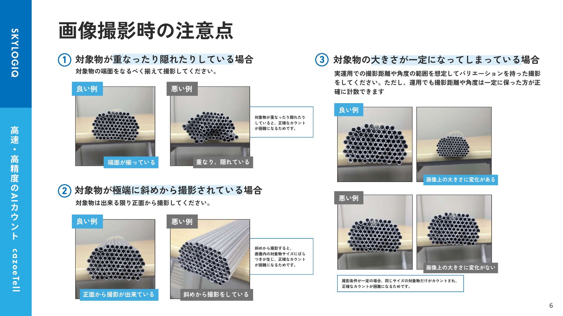 カ ウ ン ト SKYLOGIQ cazoeTell 良い例 悪い例 1 対象物が重なったり隠れたり していると、正確なカウント が困難になるためです。 対象物の端面をなるべく揃えて撮影してください。 端面が揃っている 重なり、隠れている 良い例 悪い例 斜めから撮影すると、 画像内の対象物サイズにばら つきが生じ、正確なカウント が困難になるためです。 2 対象物が極端に斜めから撮影されている場合 対象物は出来る限り正面から撮影してください。 正面から撮影が出来ている 斜めから撮影をしている 対象物が重なったり隠れたりしている場合 6 撮影条件が一定の場合、同じサイズの対象物だけがカウントされ、 正確なカウントが困難になるためです。 3 対象物の大きさが一定になってしまっている場合 実運用での撮影距離や角度の範囲を想定してバリエーションを持った撮影 をしてください。ただし、運用でも撮影距離や角度は一定に保った方が正 確に計数できます 画像上の大きさに変化がある 画像上の大きさに変化がない 良い例 悪い例