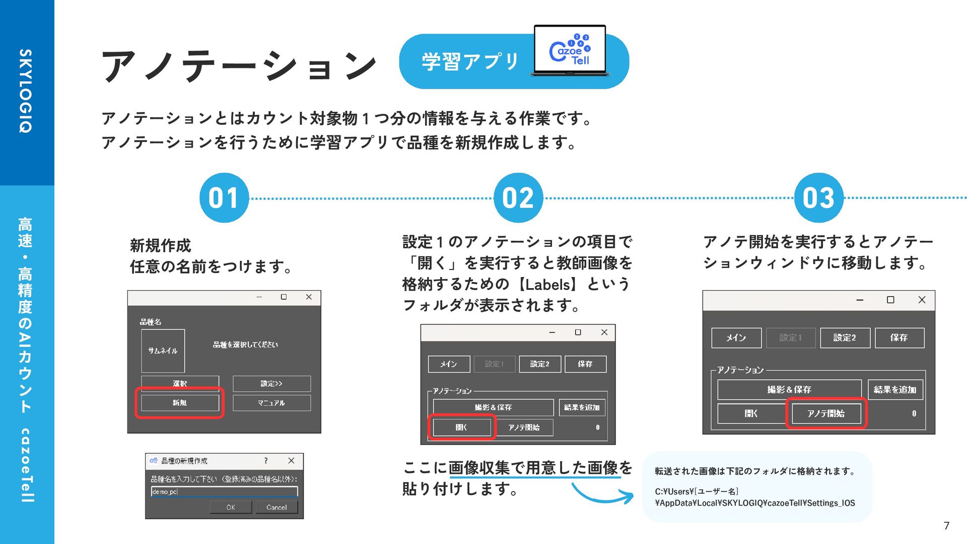 度 の AI カ ウ ン ト SKYLOGIQ cazoeTell 設定 1 のアノテーションの項目で 「開く」を実行すると教師画像を 格納するための【Labels】という フォルダが表示されます。 アノテーション アノテーションとはカウント対象物 1 つ分の情報を与える作業です。 アノテーションを行うために学習アプリで品種を新規作成します。 新規作成 任意の名前をつけます。 アノテ開始を実行するとアノテー ションウィンドウに移動します。 7 転送された画像は下記のフォルダに格納されます。 C:\Users\[ユーザー名] \AppData\Local\SKYLOGIQ\cazoeTell\Settings_IOS ここに画像収集で用意した画像を 貼り付けします。