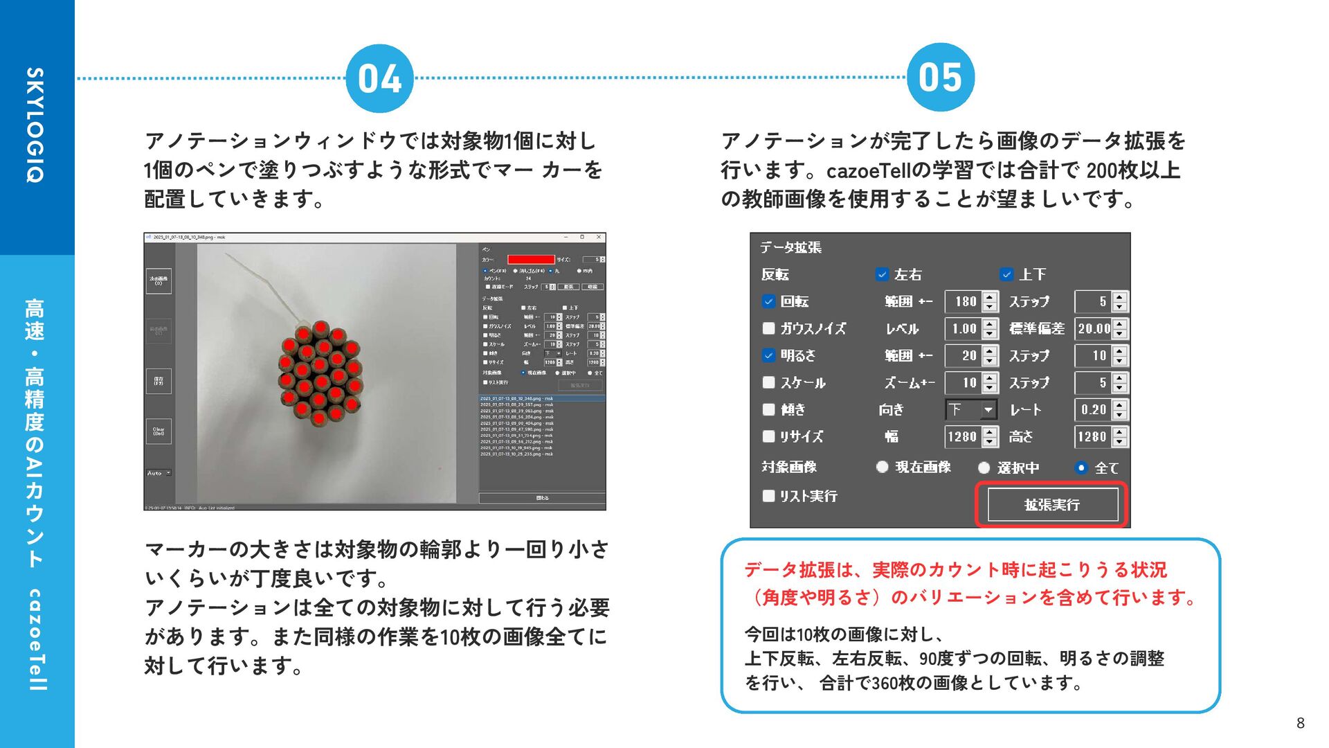の教師画像を使用することが望ましいです。 マーカーの大きさは対象物の輪郭より一回り小さ いくらいが丁度良いです。 アノテーションは全ての対象物に対して行う必要 があります。また同様の作業を10枚の画像全てに 対して行います。 今回は10枚の画像に対し、 上下反転、左右反転、90度ずつの回転、明るさの調整 を行い、 合計で360枚の画像としています。 高 速 ・ 高 精 度 の AI カ ウ ン ト SKYLOGIQ cazoeTell 8 データ拡張は、実際のカウント時に起こりうる状況 (角度や明るさ)のバリエーションを含めて行います。